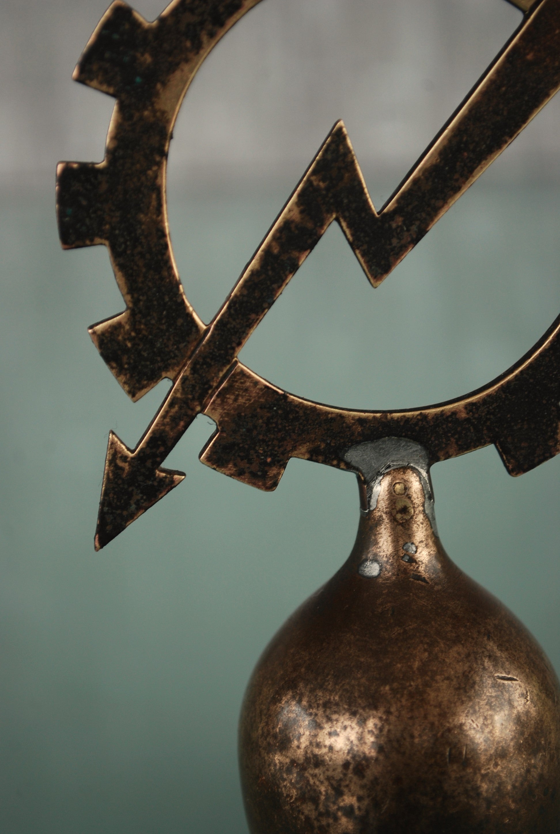 Het is gemaakt van 3 stukken brons of messing die aan elkaar geklonken en gesoldeerd zijn.