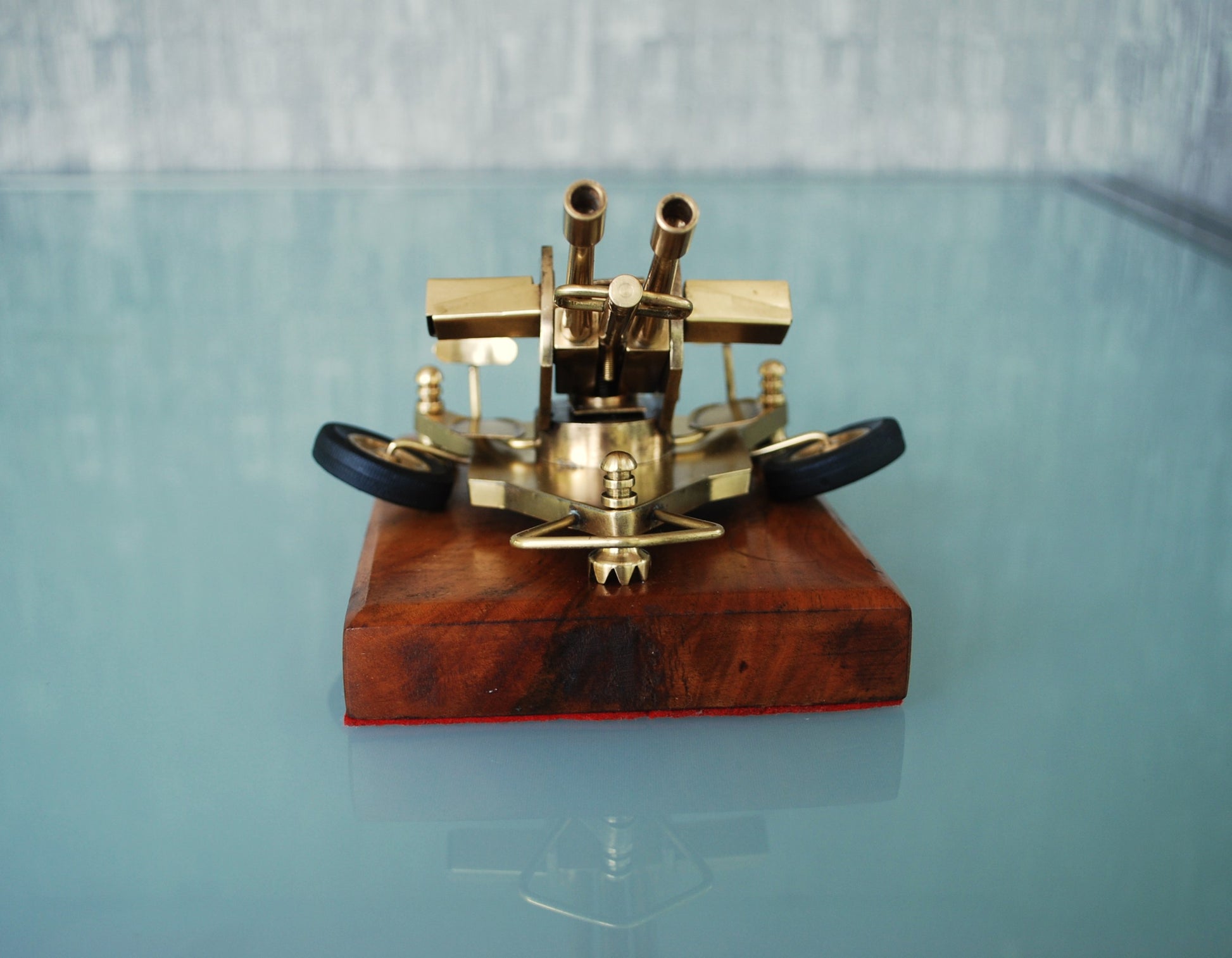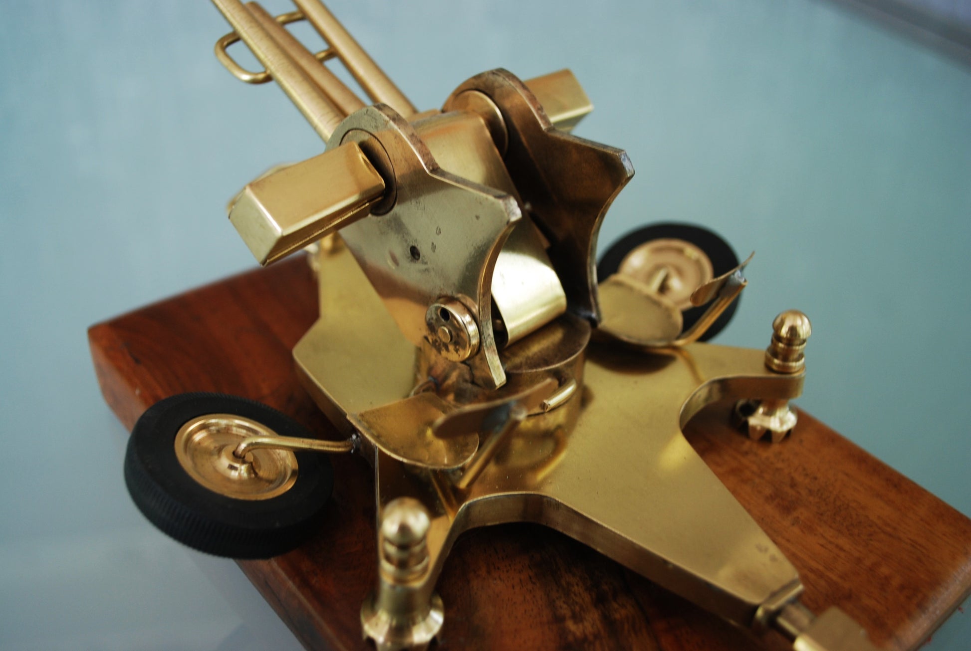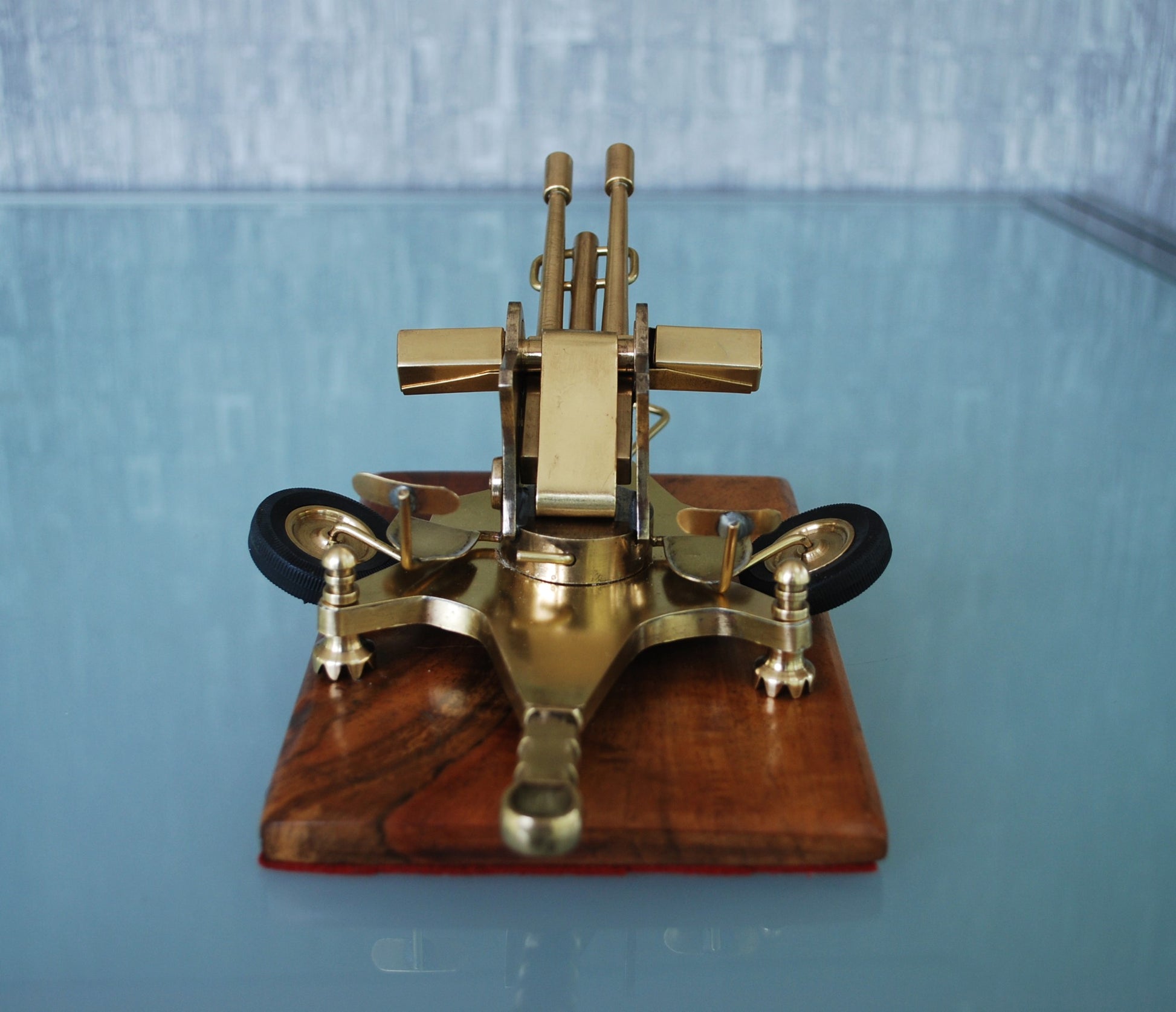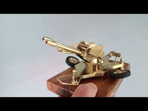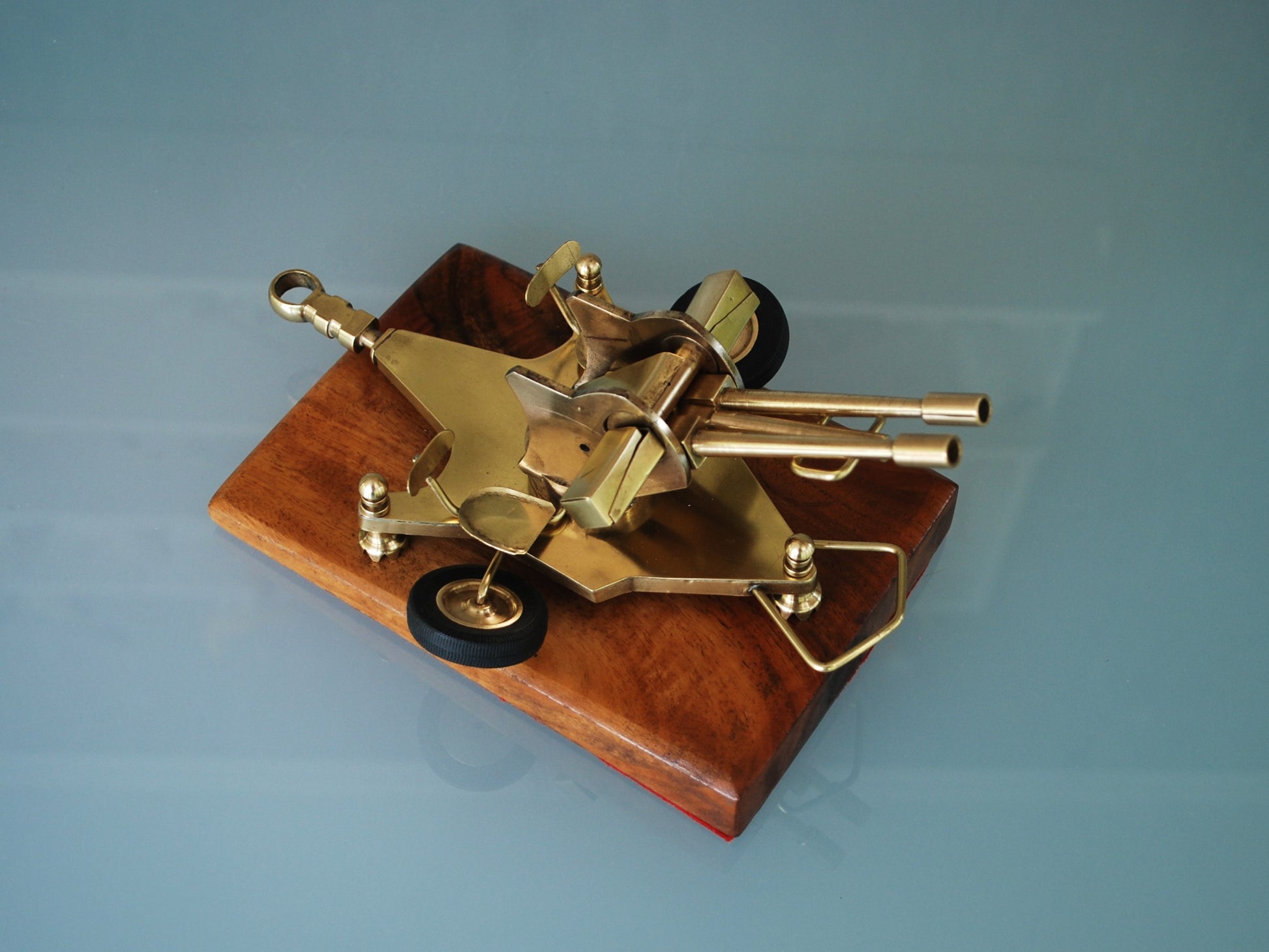 ZU-23 Dubbelloops Luchtafweerkanon Messing model op teakhouten sokkel. 1960