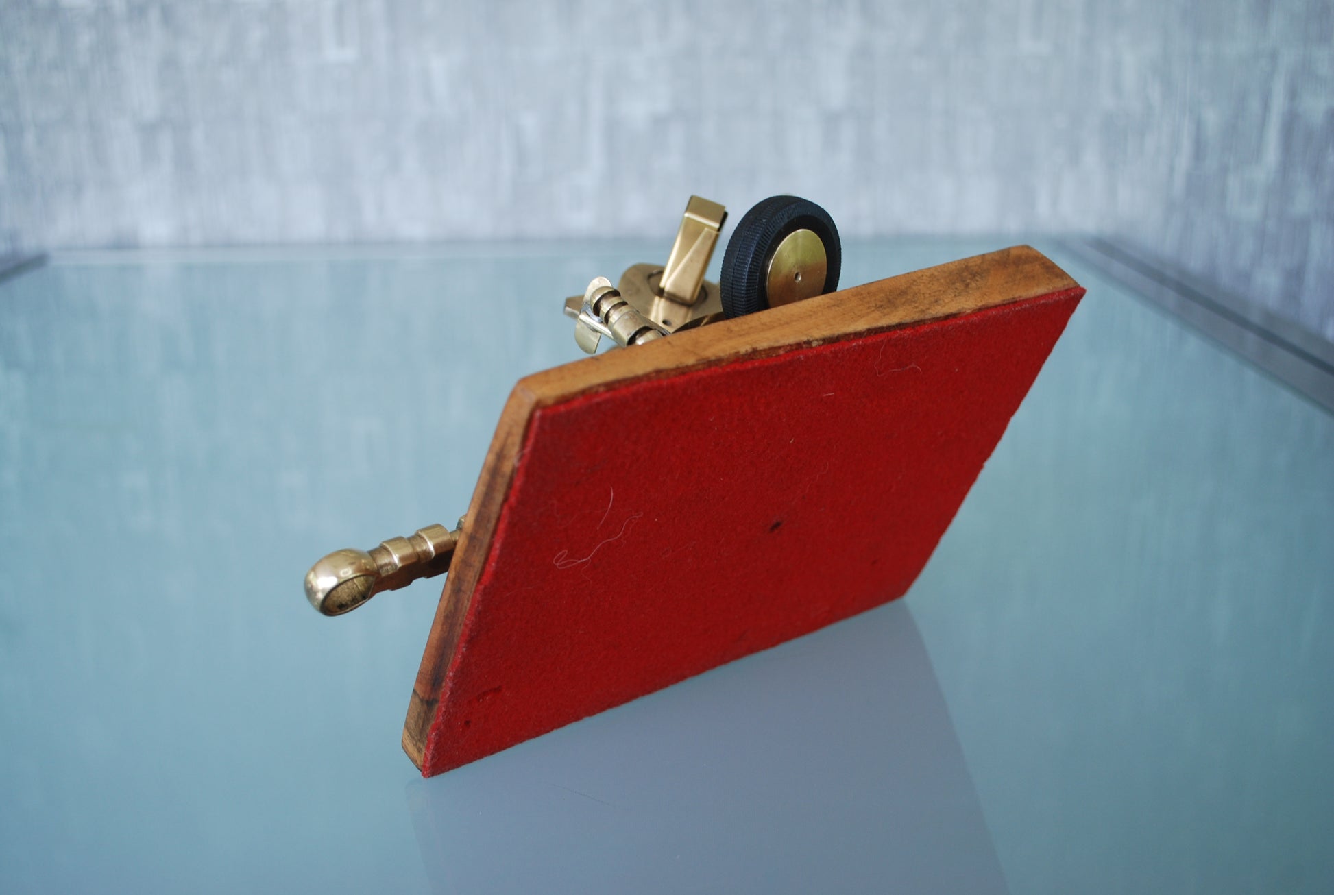 De sokkel loopt op aan de voorkant en is rood vanonder bekleed.
