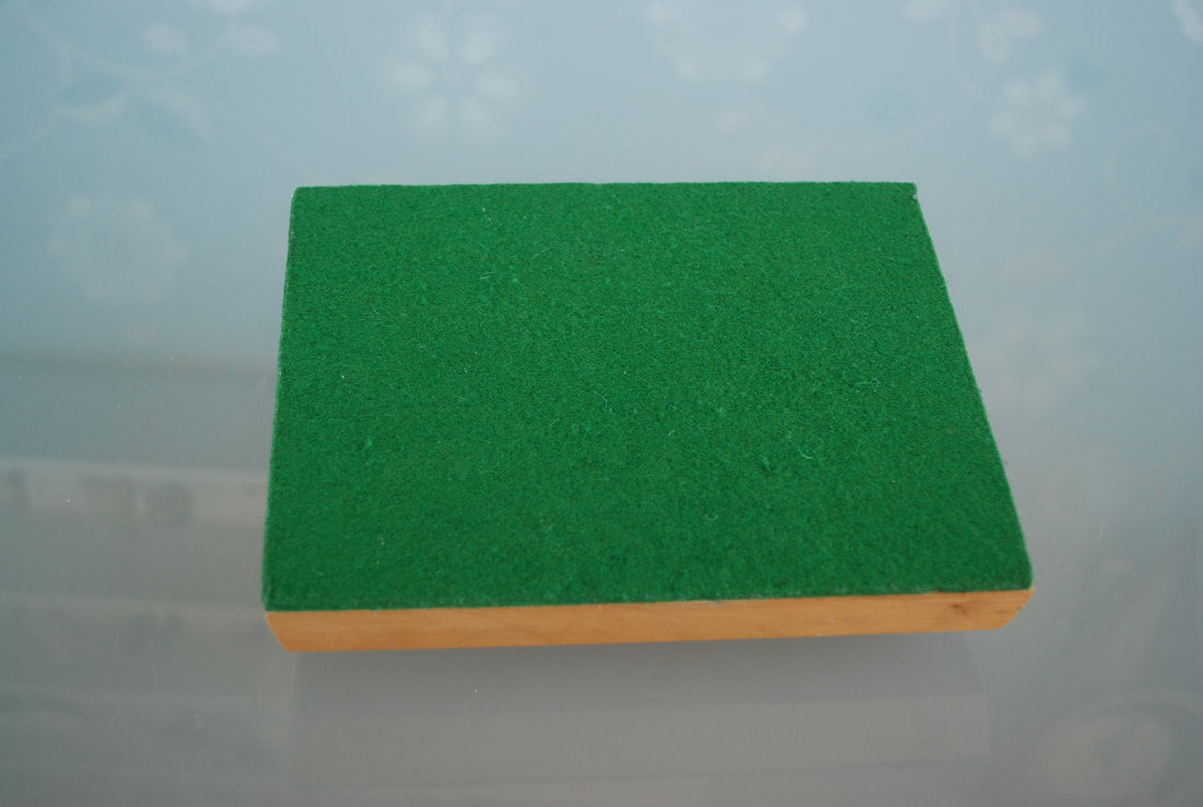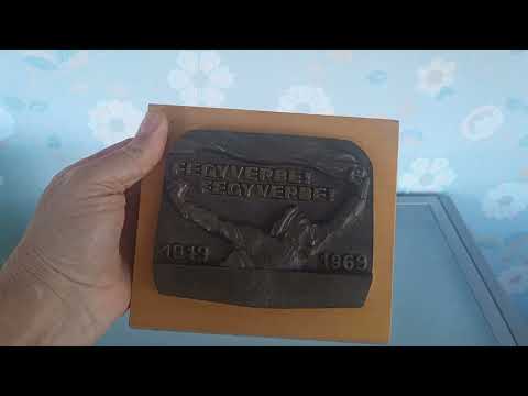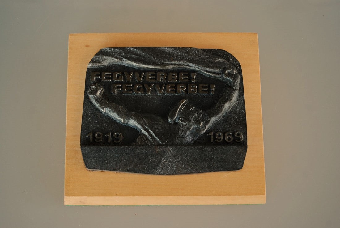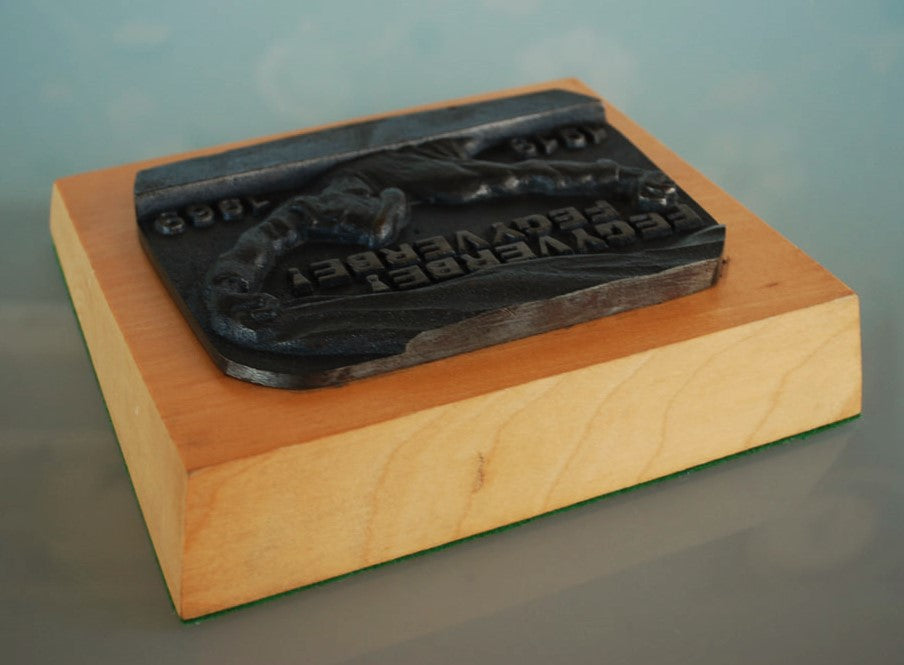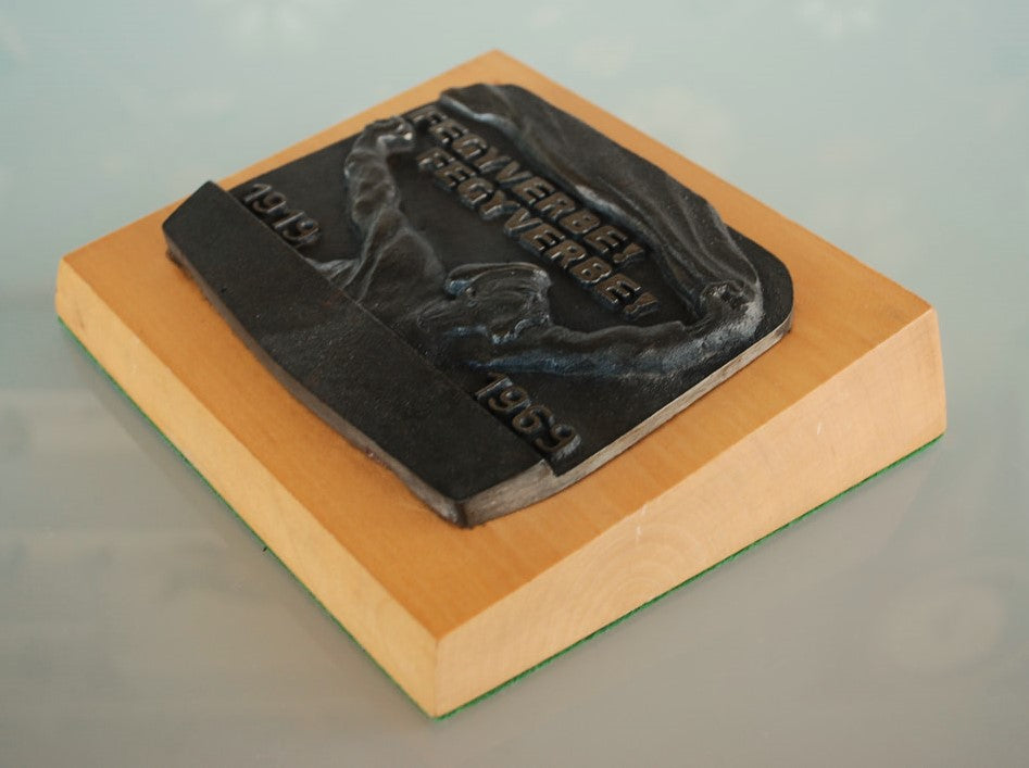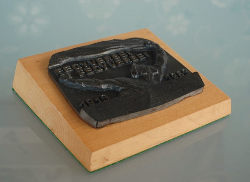 Plaque is gemaakt van gietijzer en ligt op een blank gelakt, schuin oplopend beukenhout voetstuk wat met groen stof vanonder bekleed is.