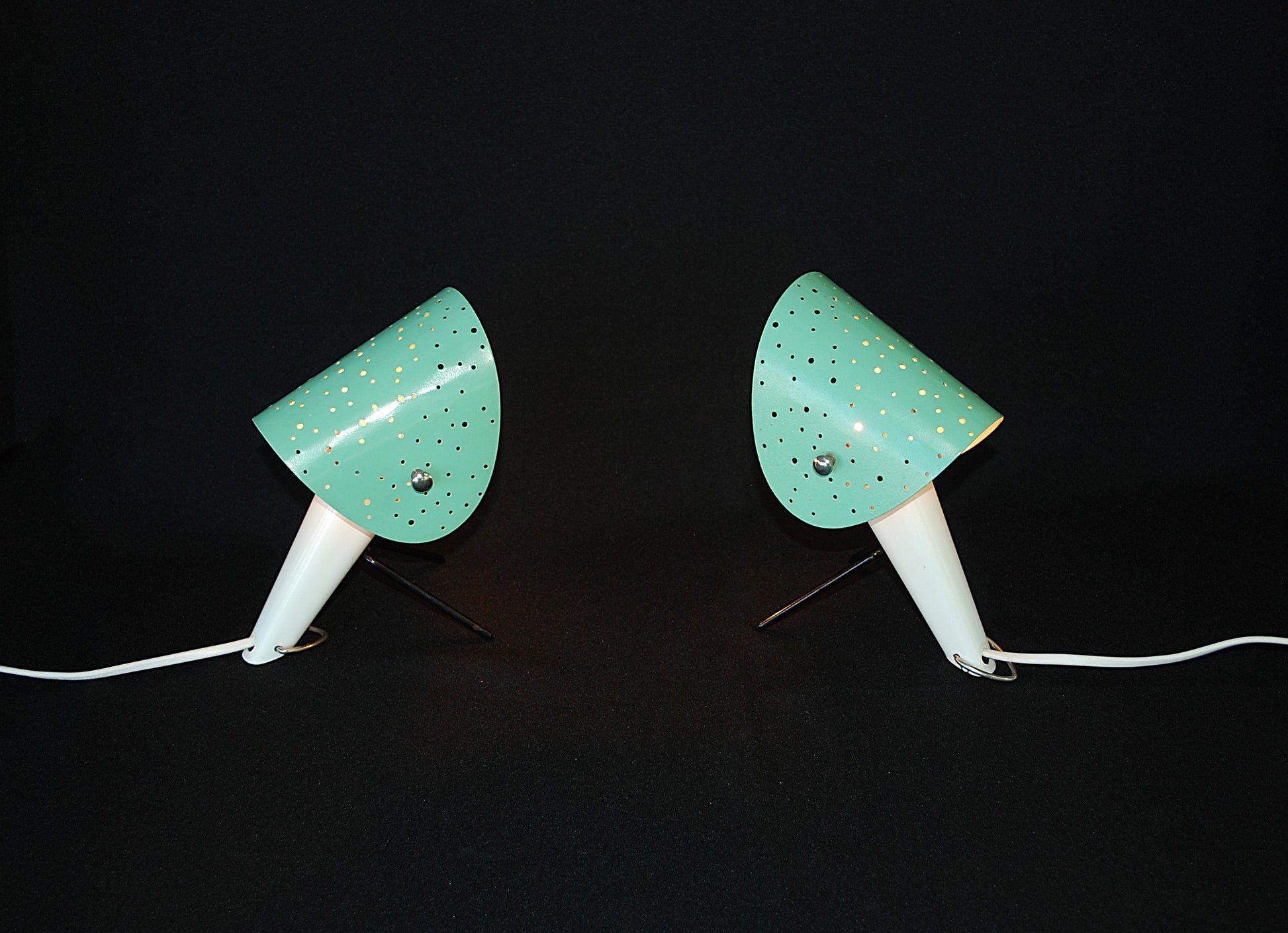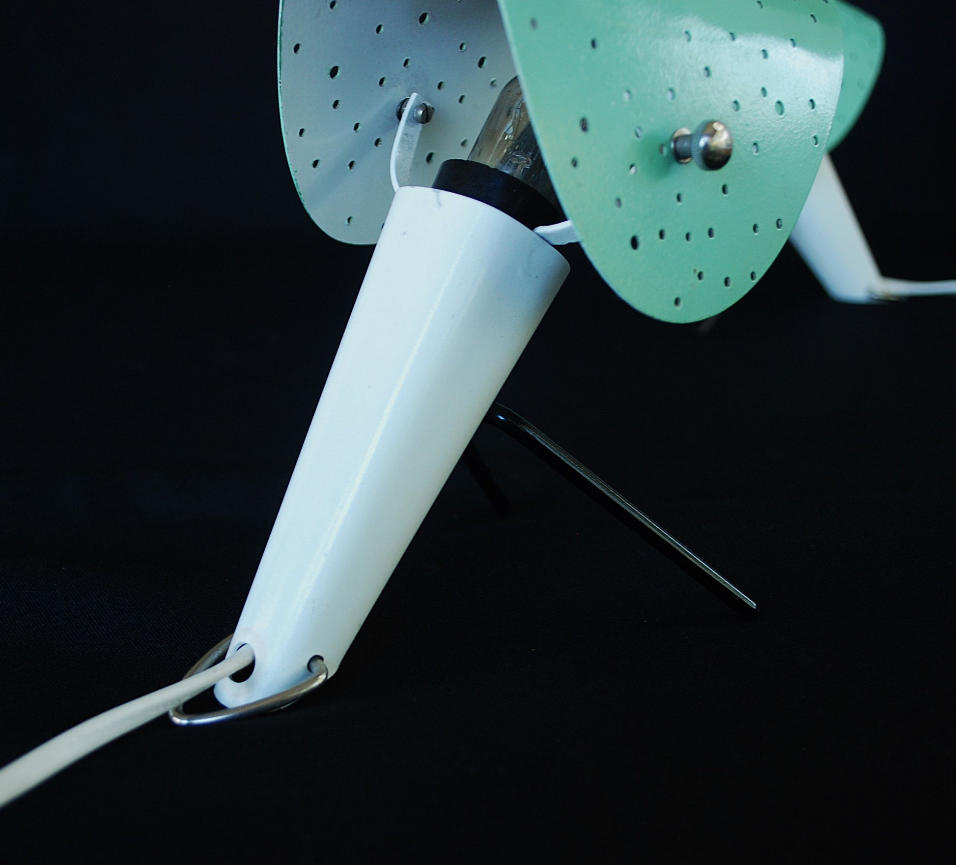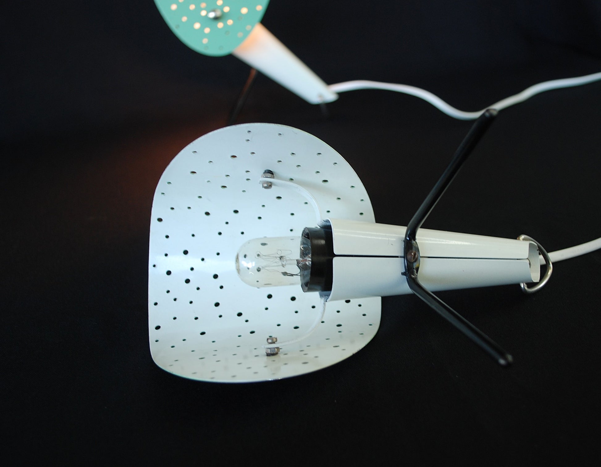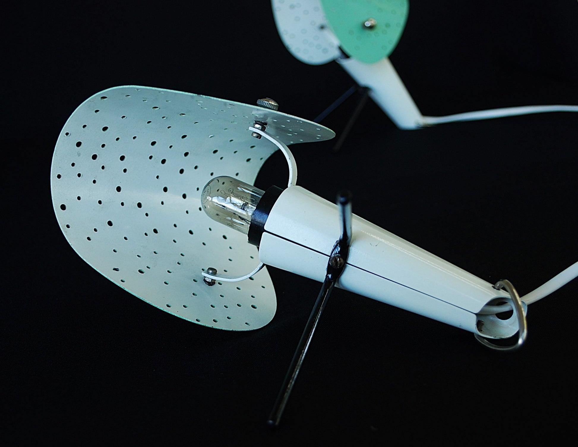 Lampen zijn gemaakt van gelakte metalen behuizingen met V-vormige gelakte metalen poten en gelakte geperforeerd plaatstaal lampenkappen, verstelbare.