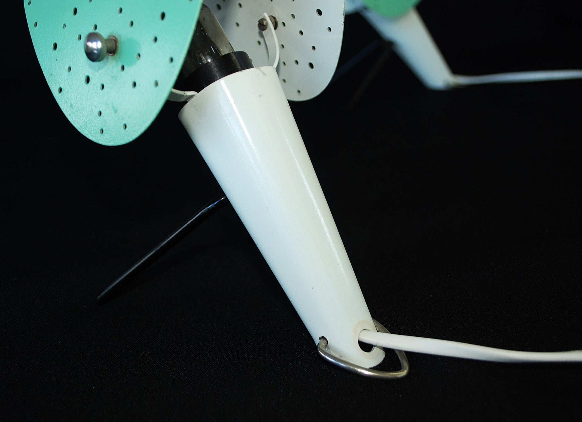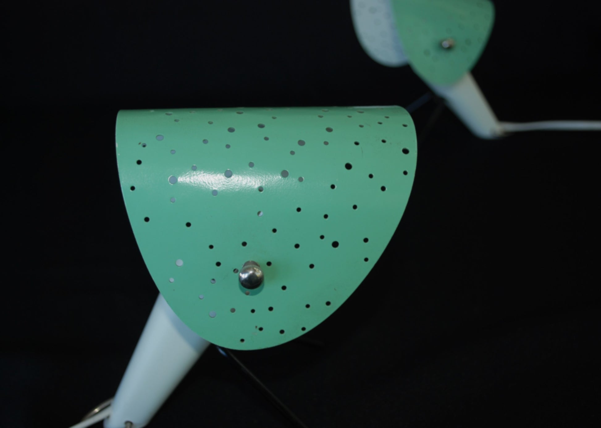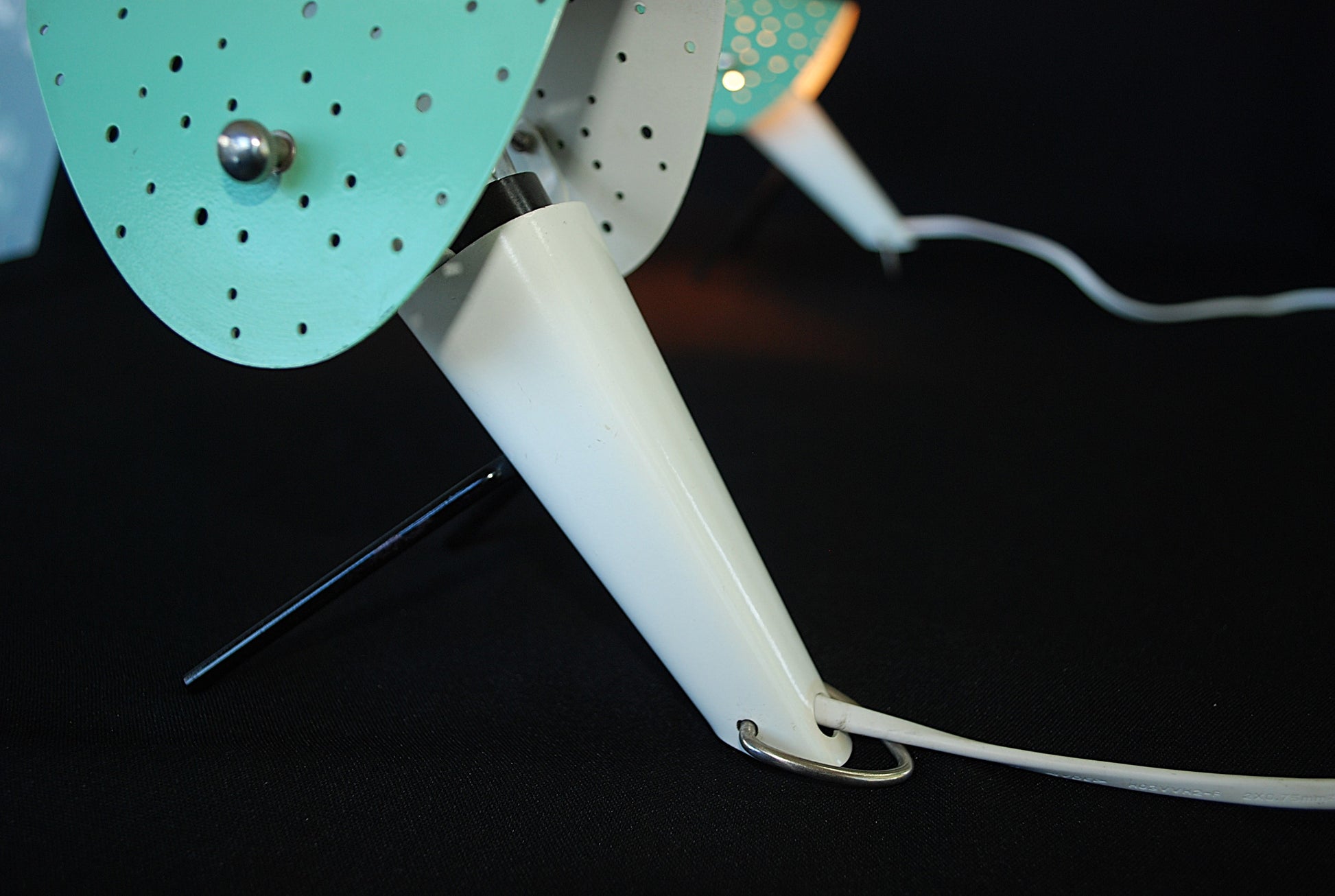 Lampen zijn gemaakt van gelakte metalen behuizingen met V-vormige gelakte metalen poten en gelakte geperforeerd plaatstaal lampenkappen, verstelbare.