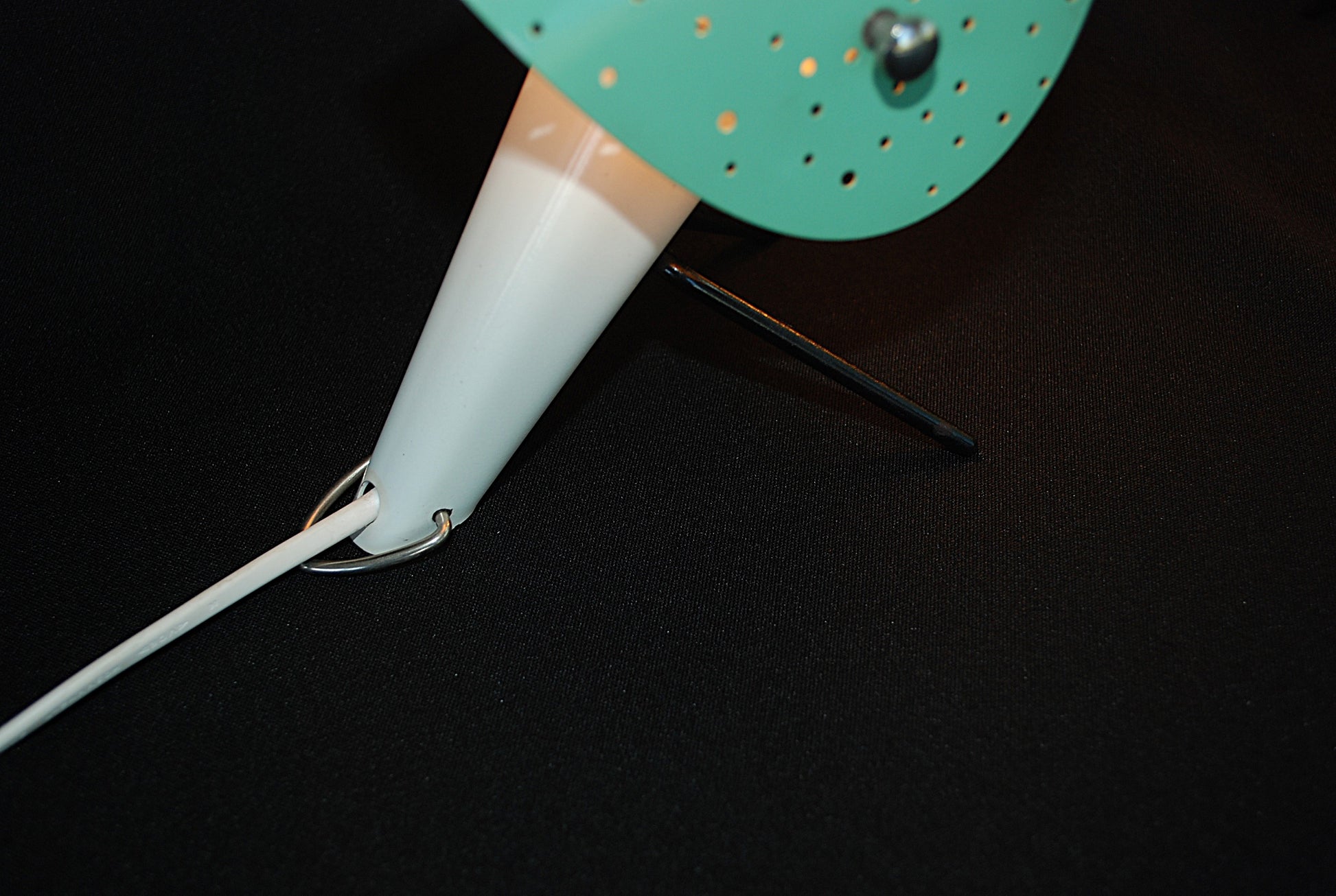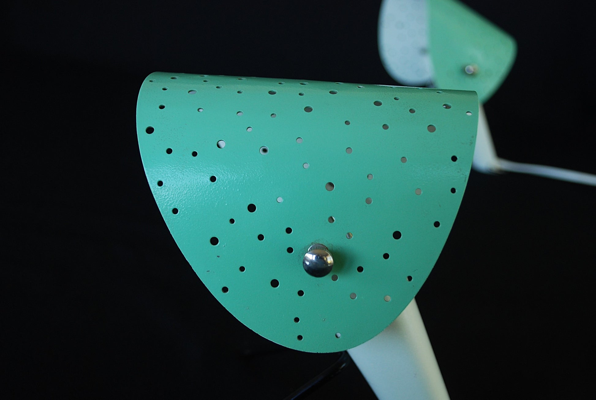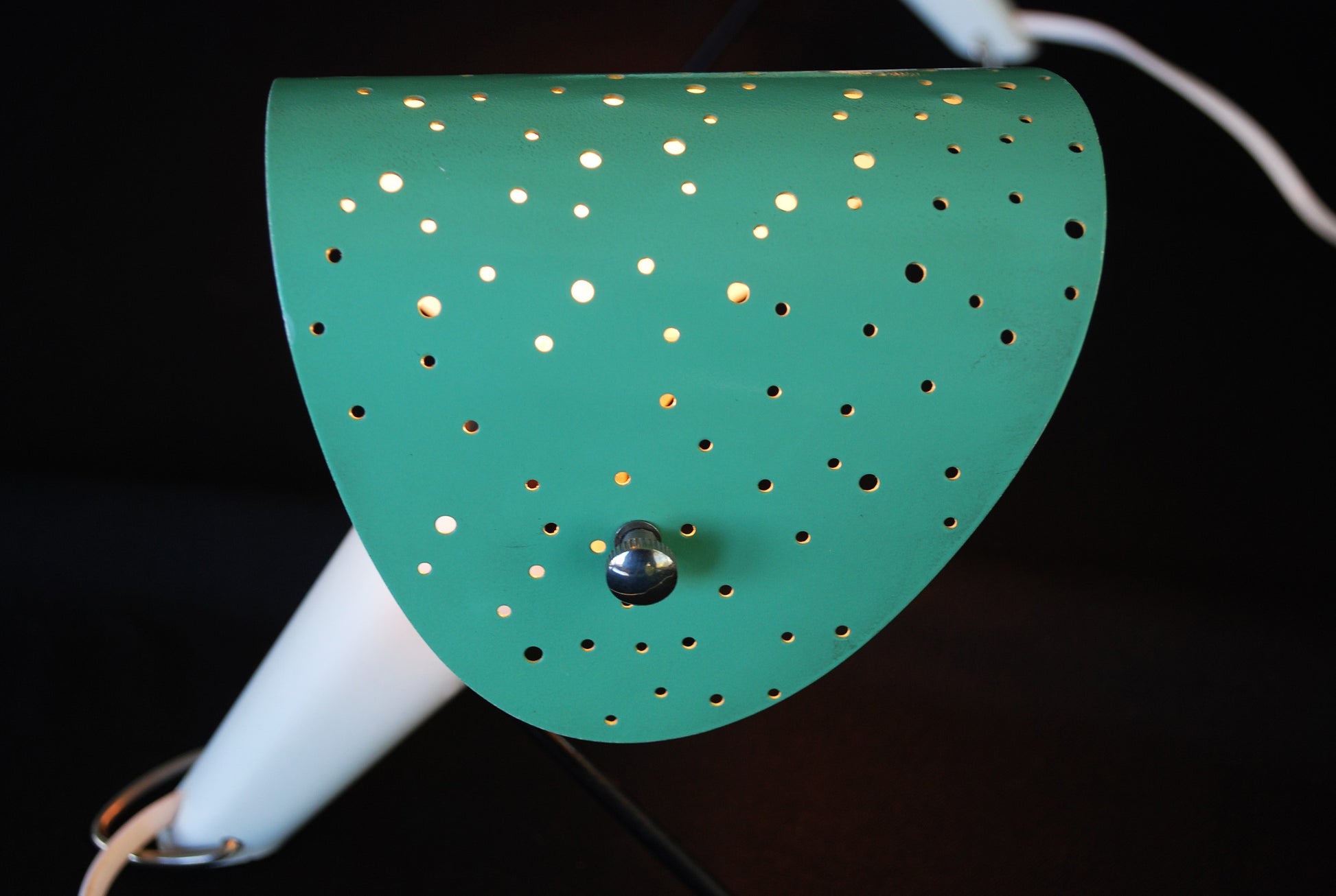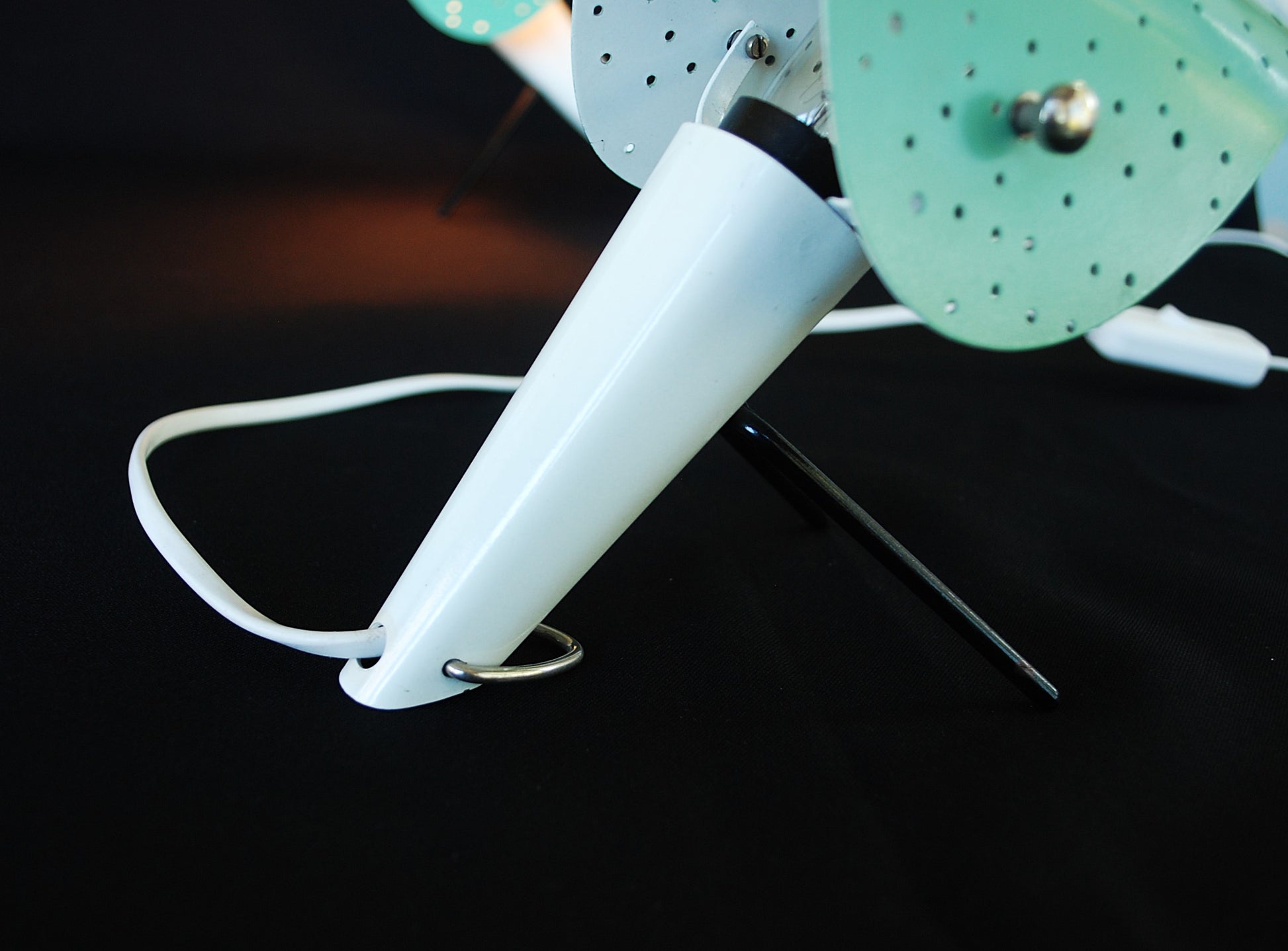 Lampen zijn gemaakt van gelakte metalen behuizingen met V-vormige gelakte metalen poten en gelakte geperforeerd plaatstaal lampenkappen, verstelbare.