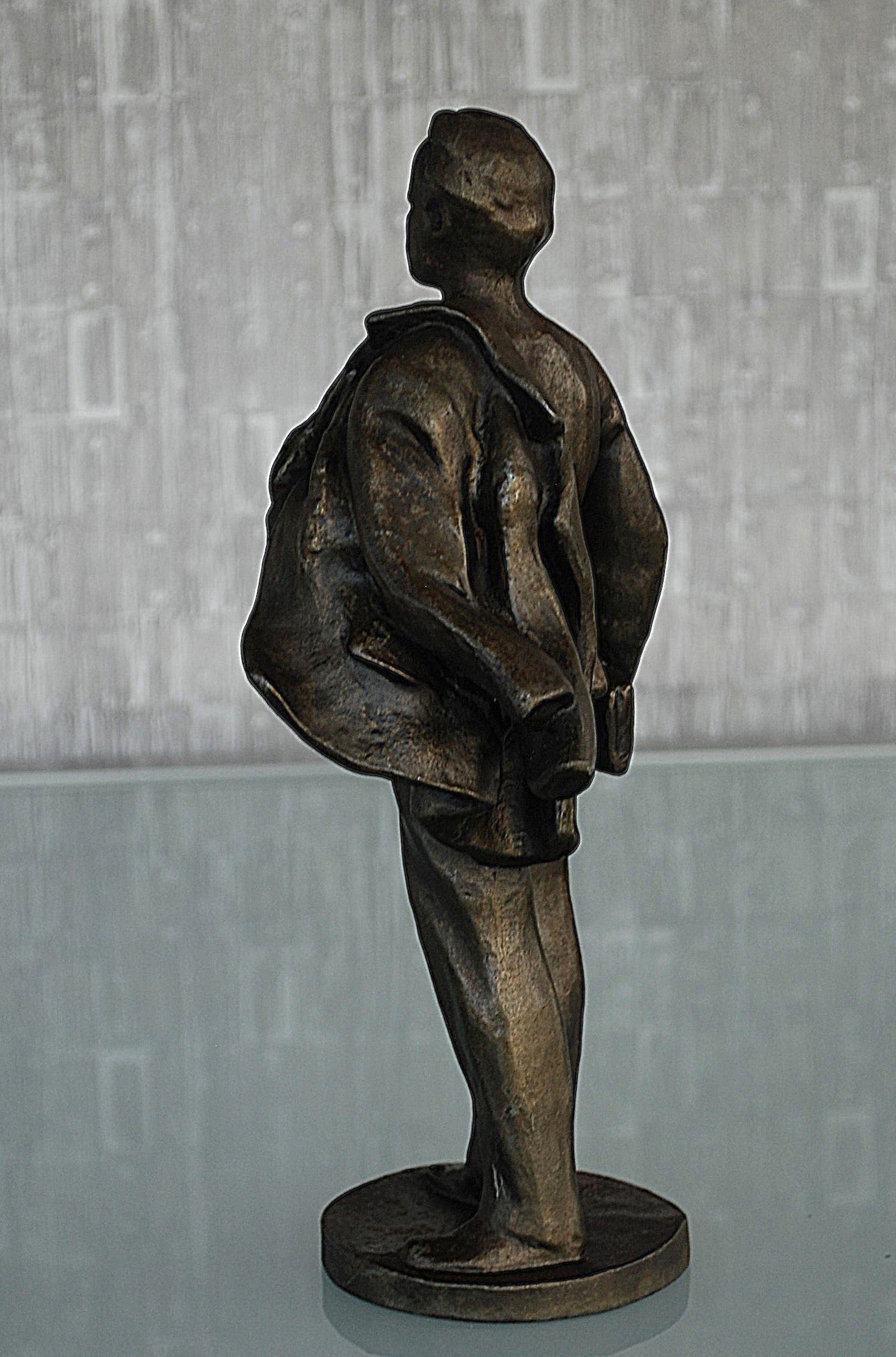 Zwaar metalen beeld van Lenin lopend als student met boek in de hand en jas over zijn schouder.