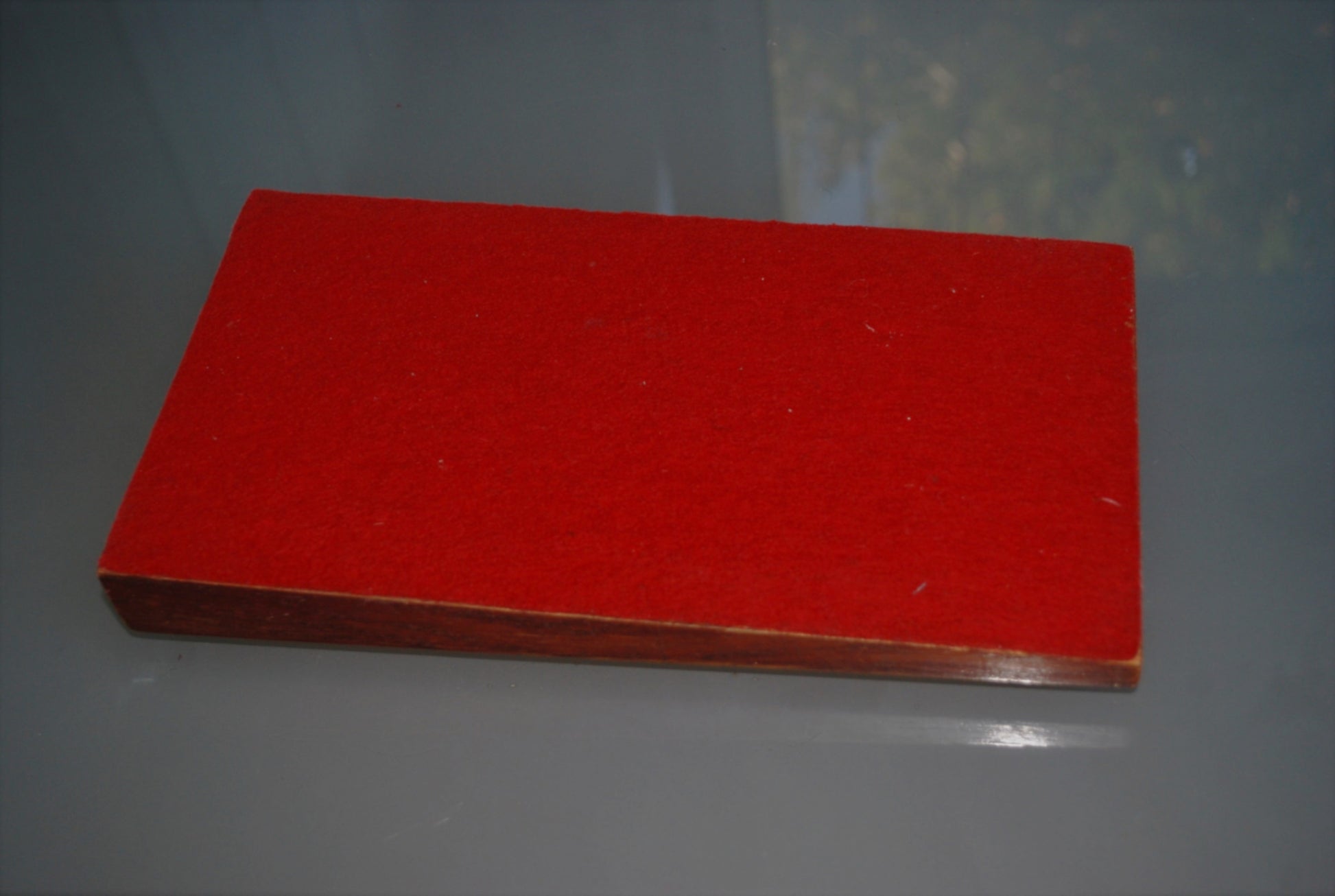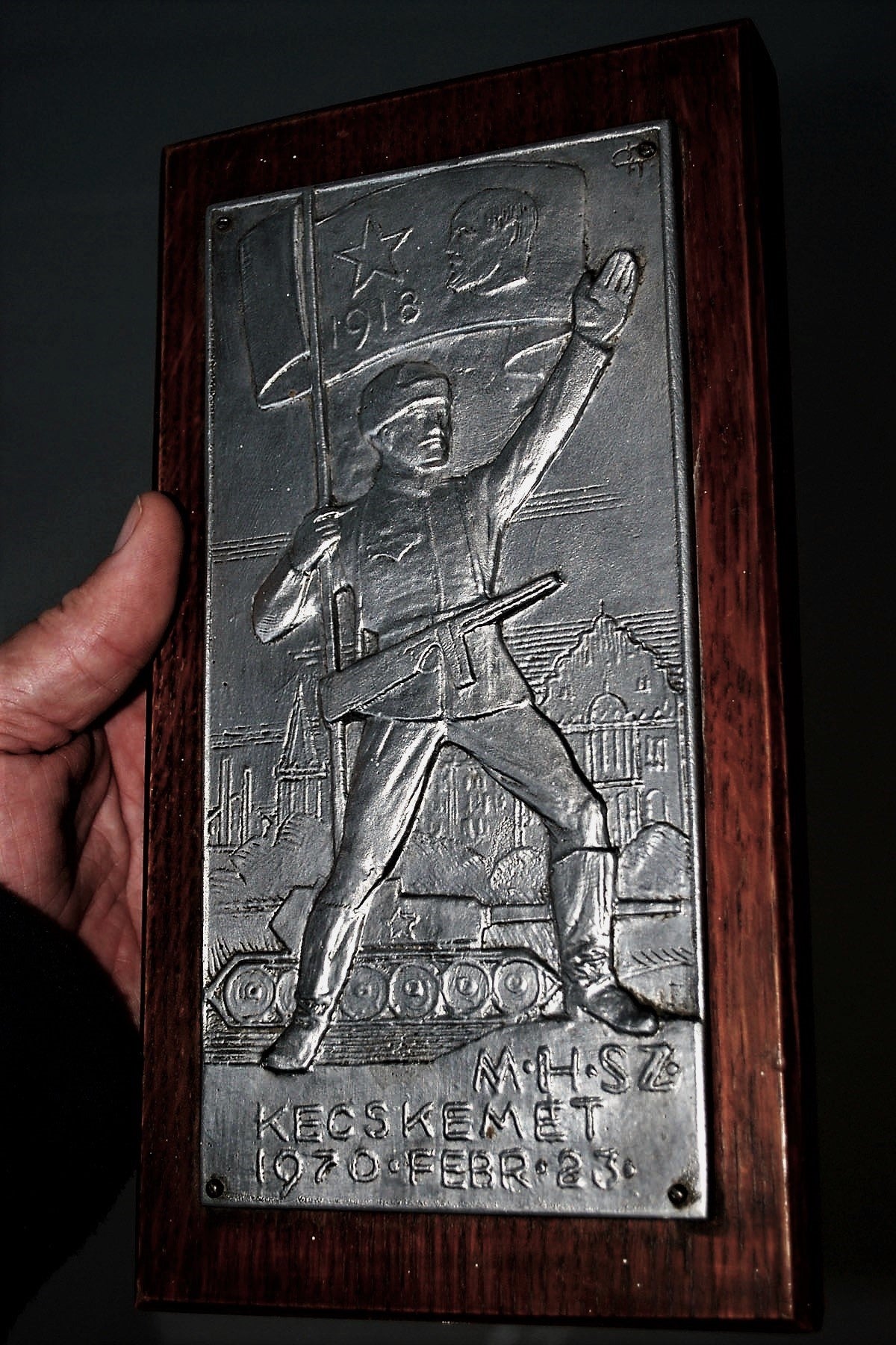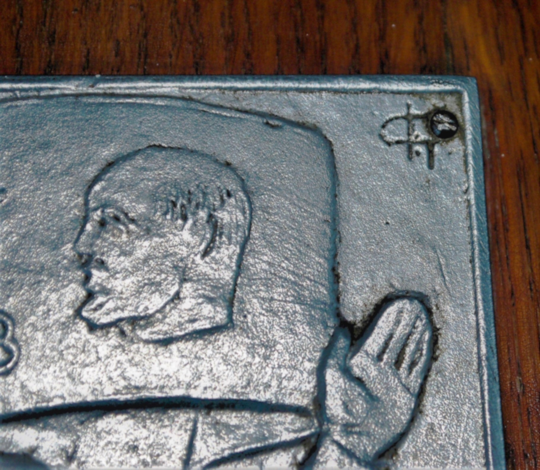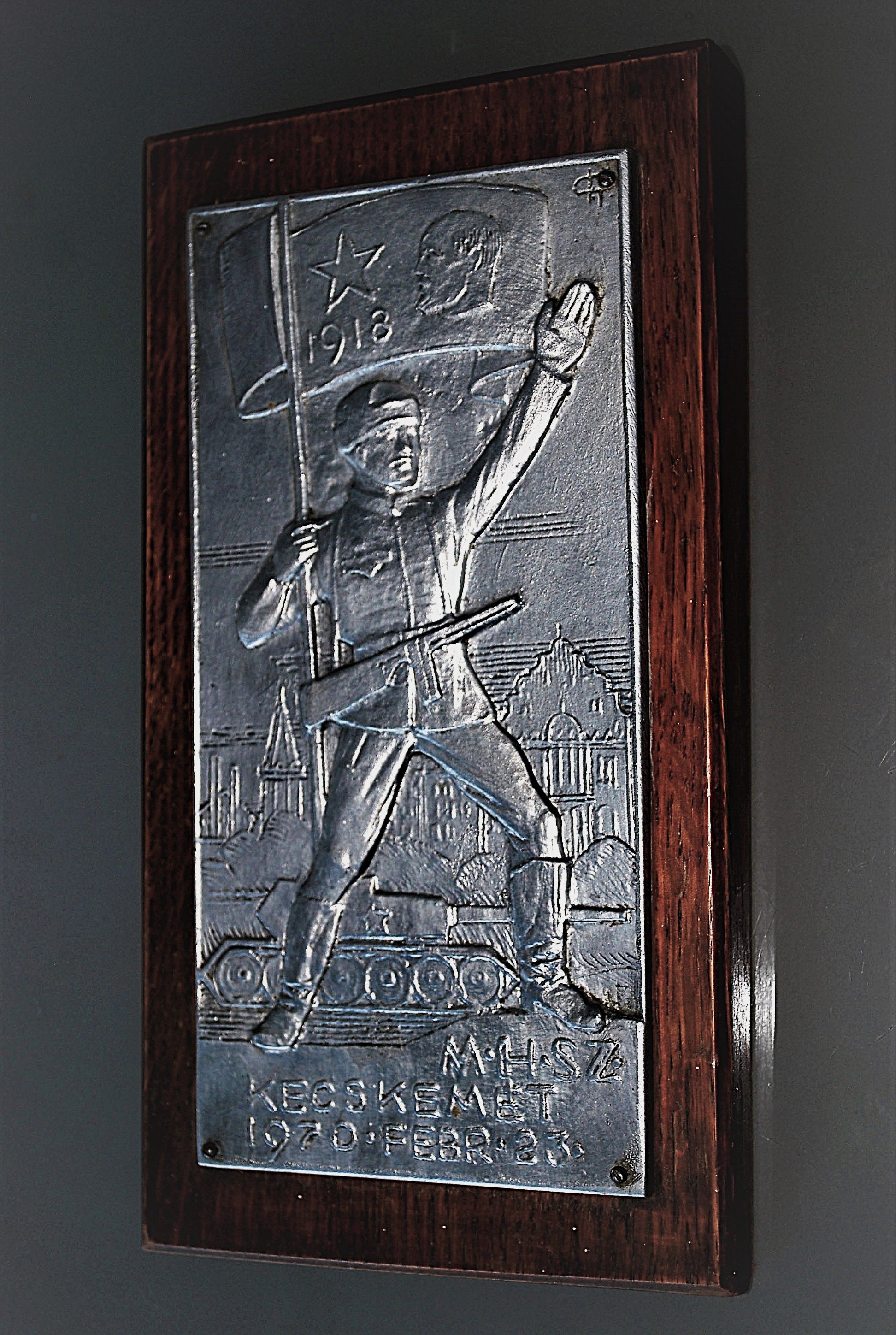 Groot rechthoekig aluminium plaque op eikenhouten oplopend achter plaat bekleed met rode vilt.