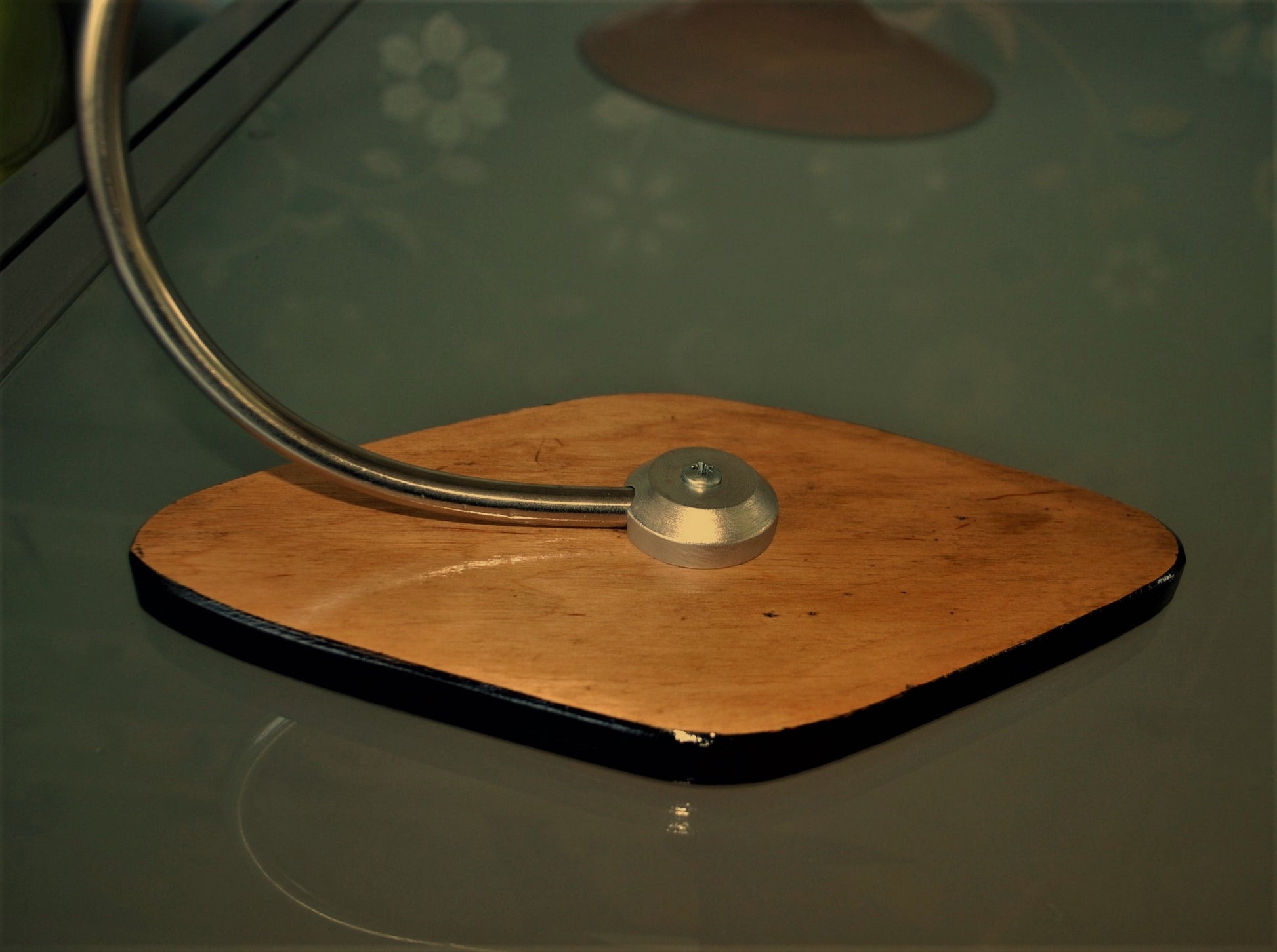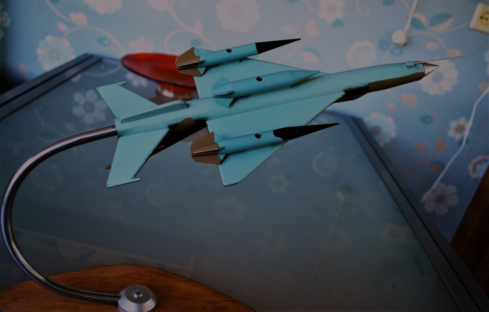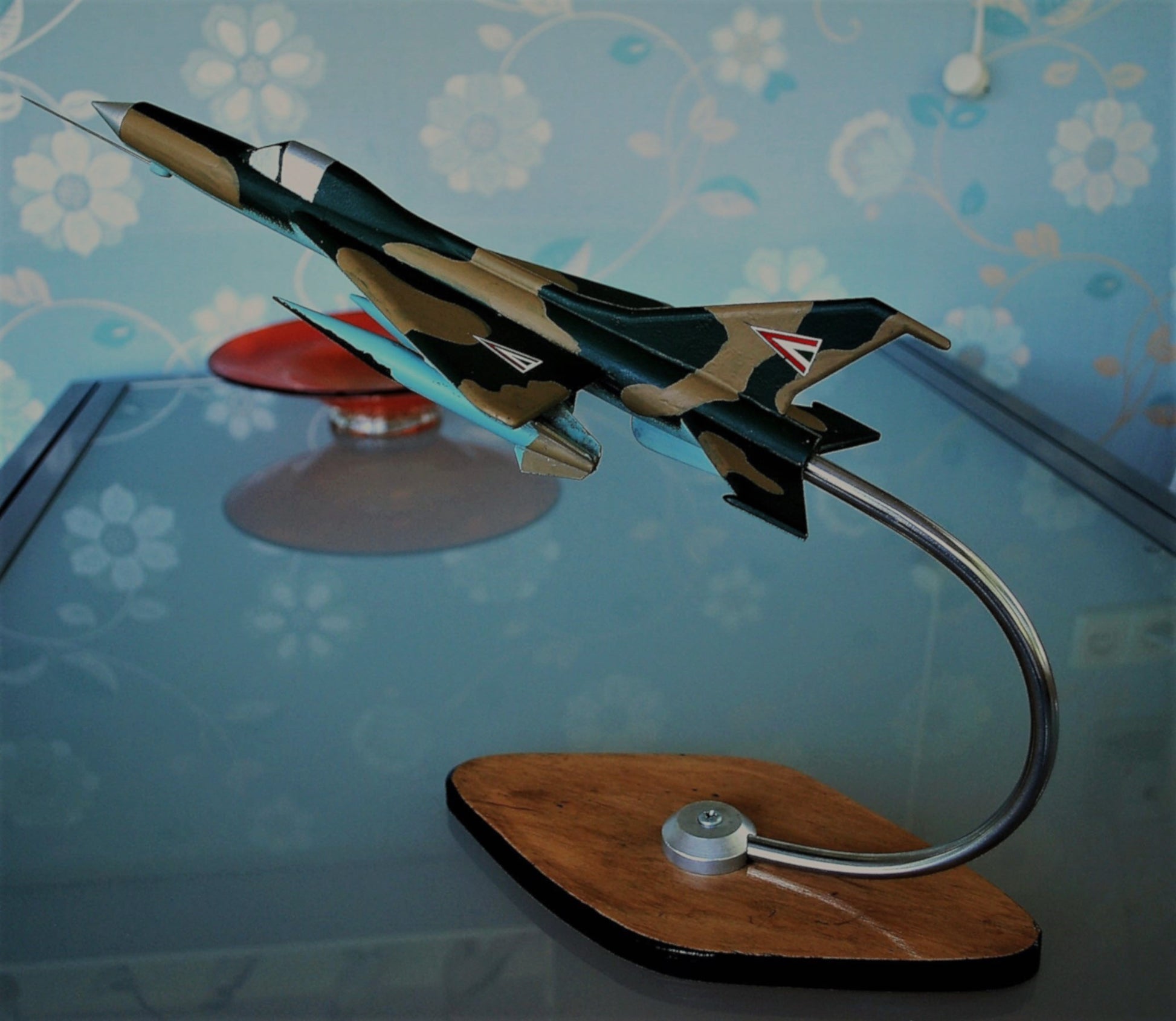 De Gevechtsstraaljager staat op een verchroomd beugel dat op een houten sokkel staat verbonden word met een aluminium schijf.