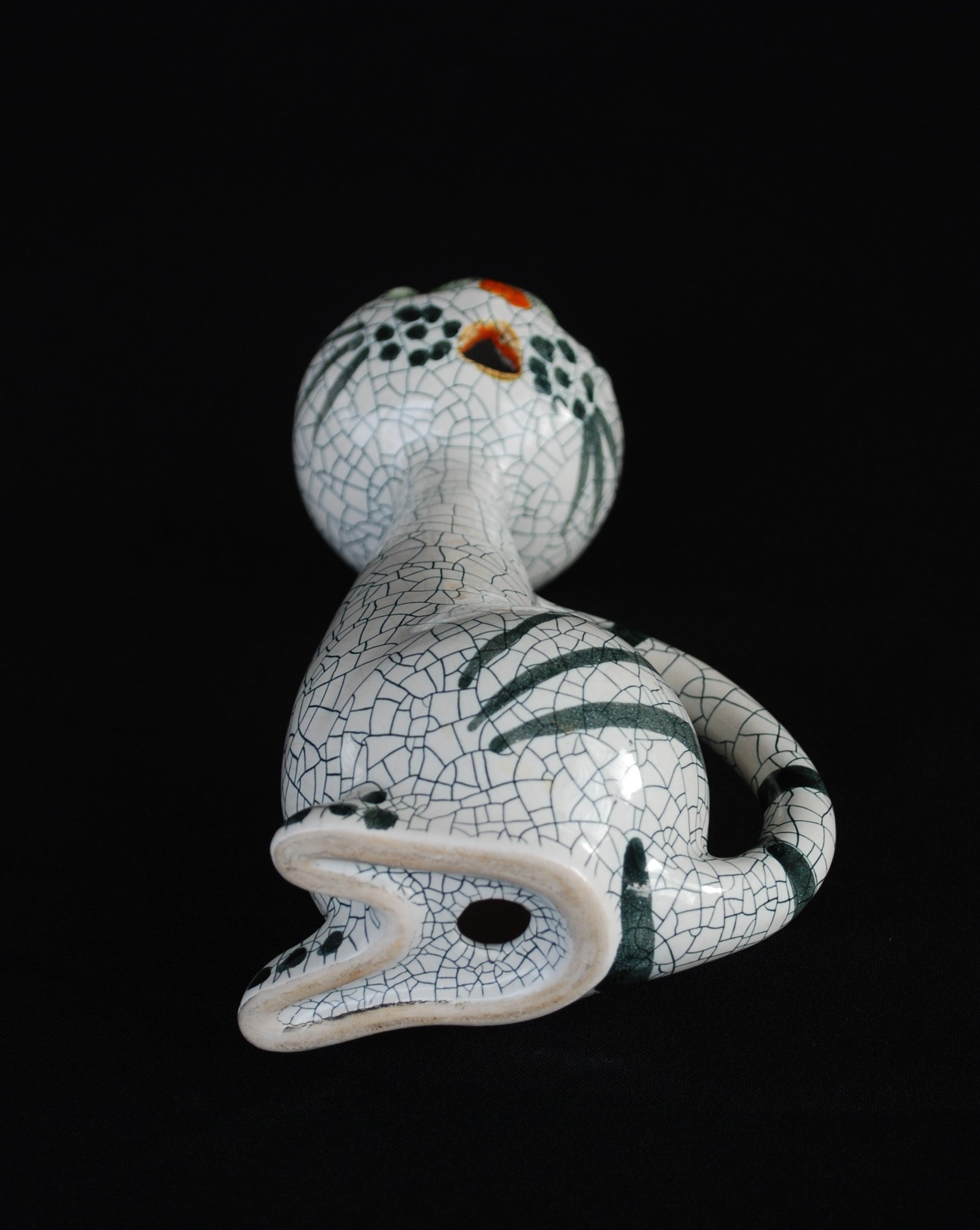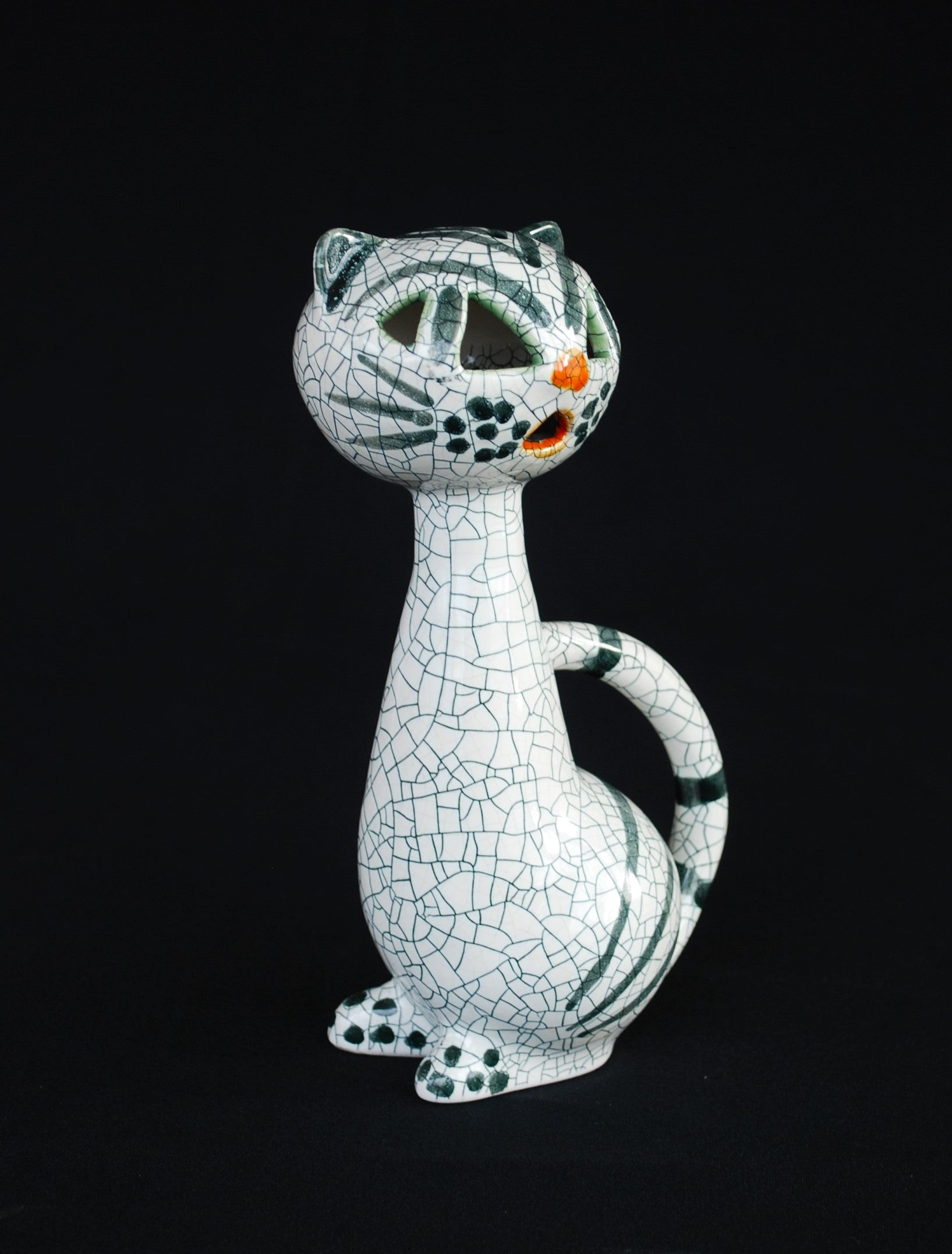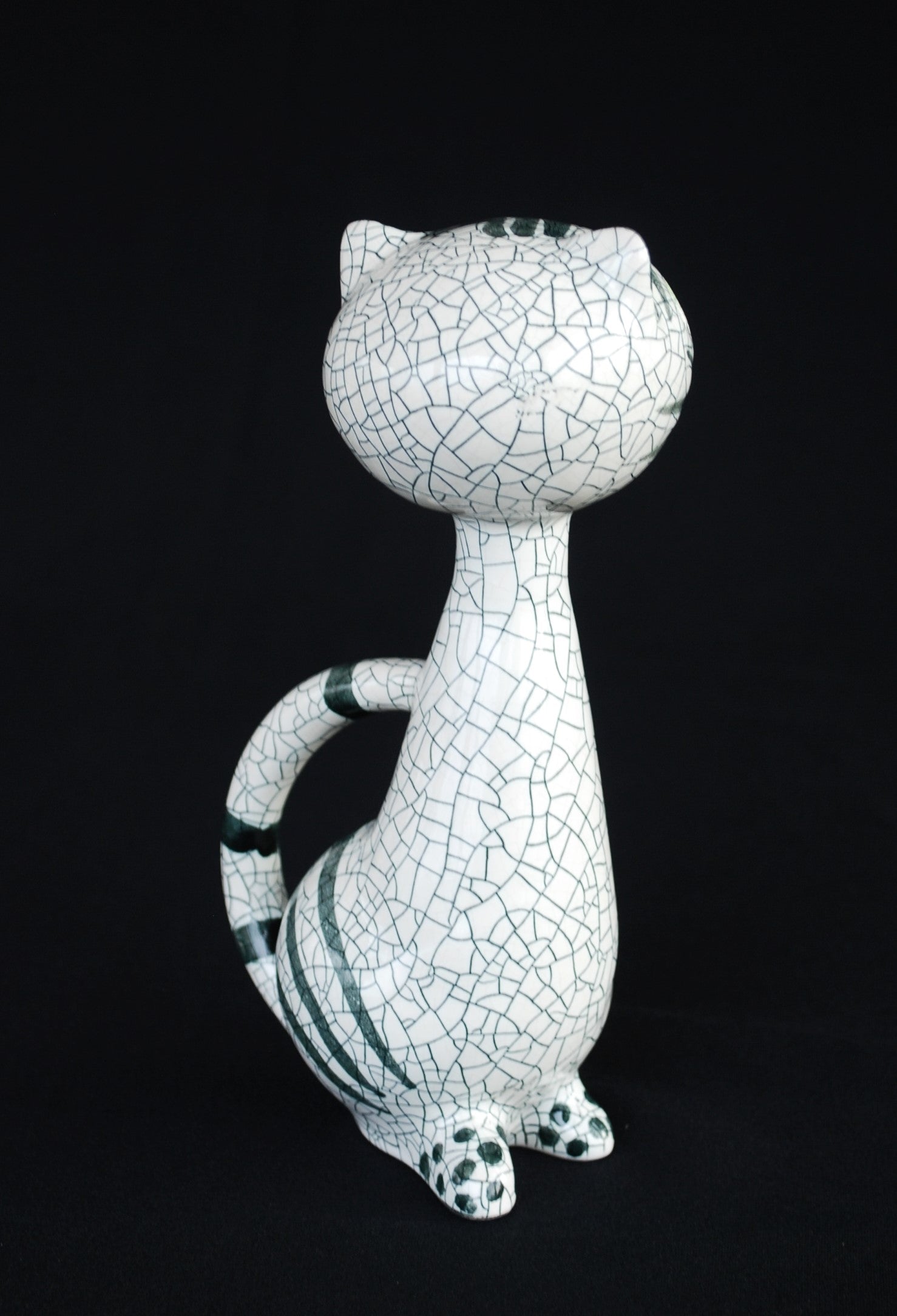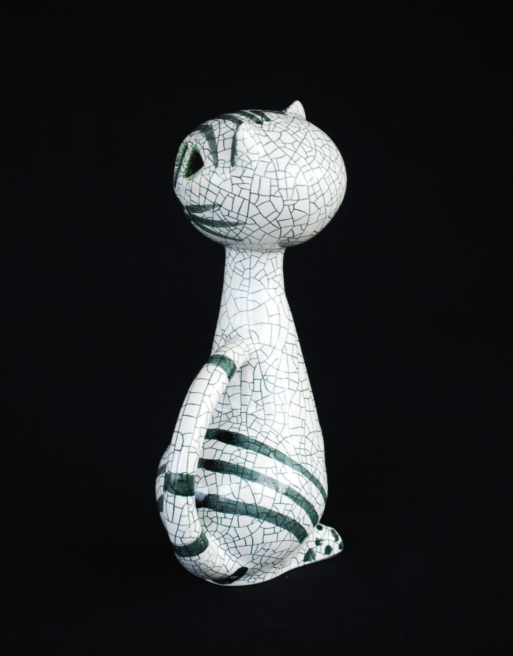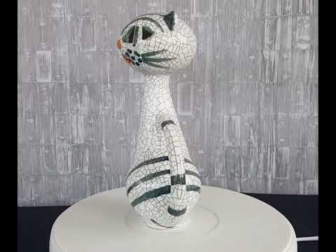 Van Livia Gorka de zittende kat Puntgaaf, gemerkt, in vitrine staat.