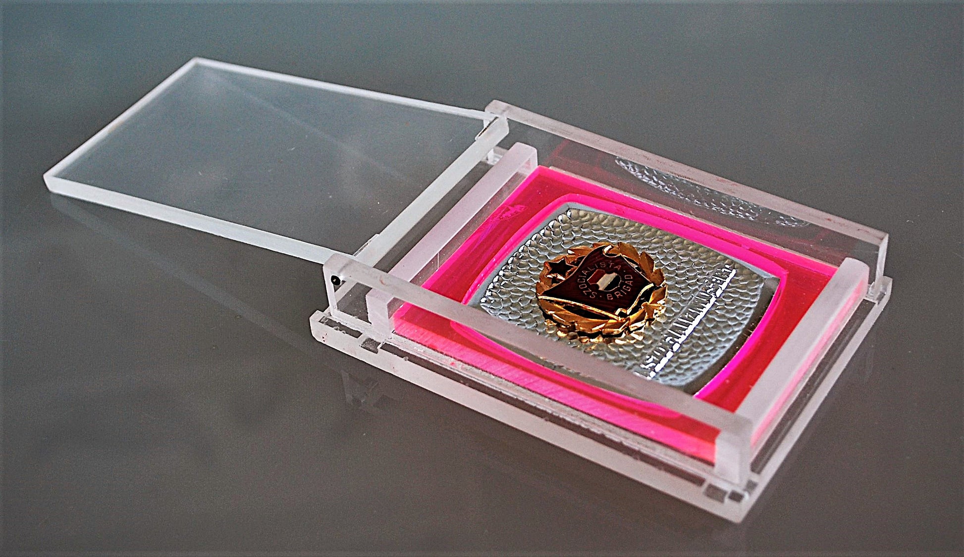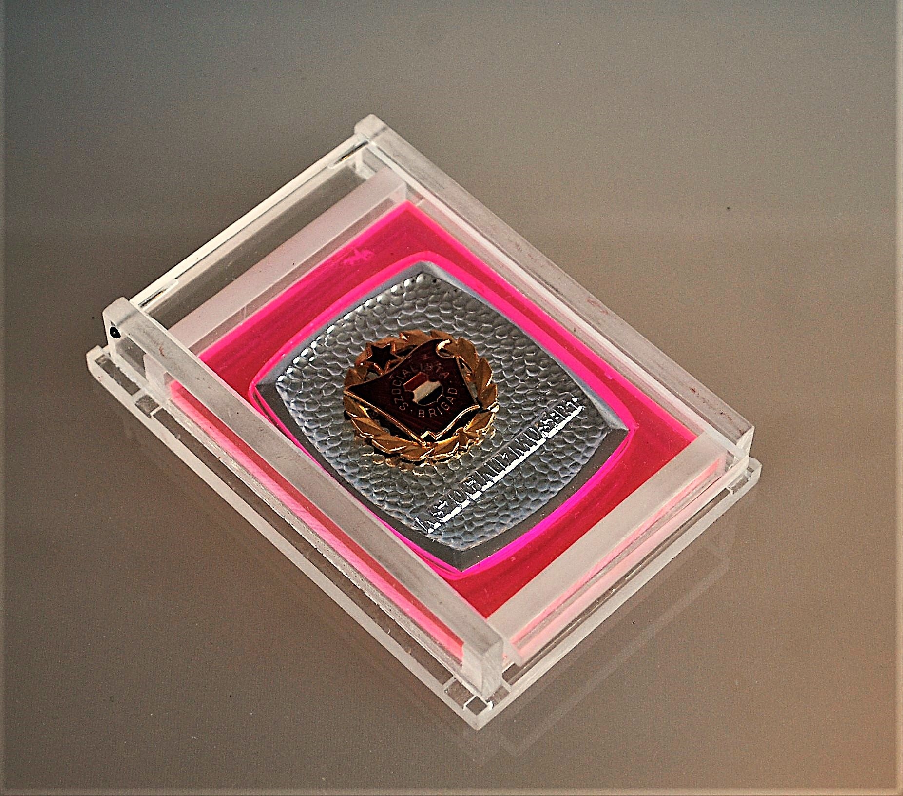 Socialistische Brigade in doorzichtig doos met fluorescerend binnenkant.
