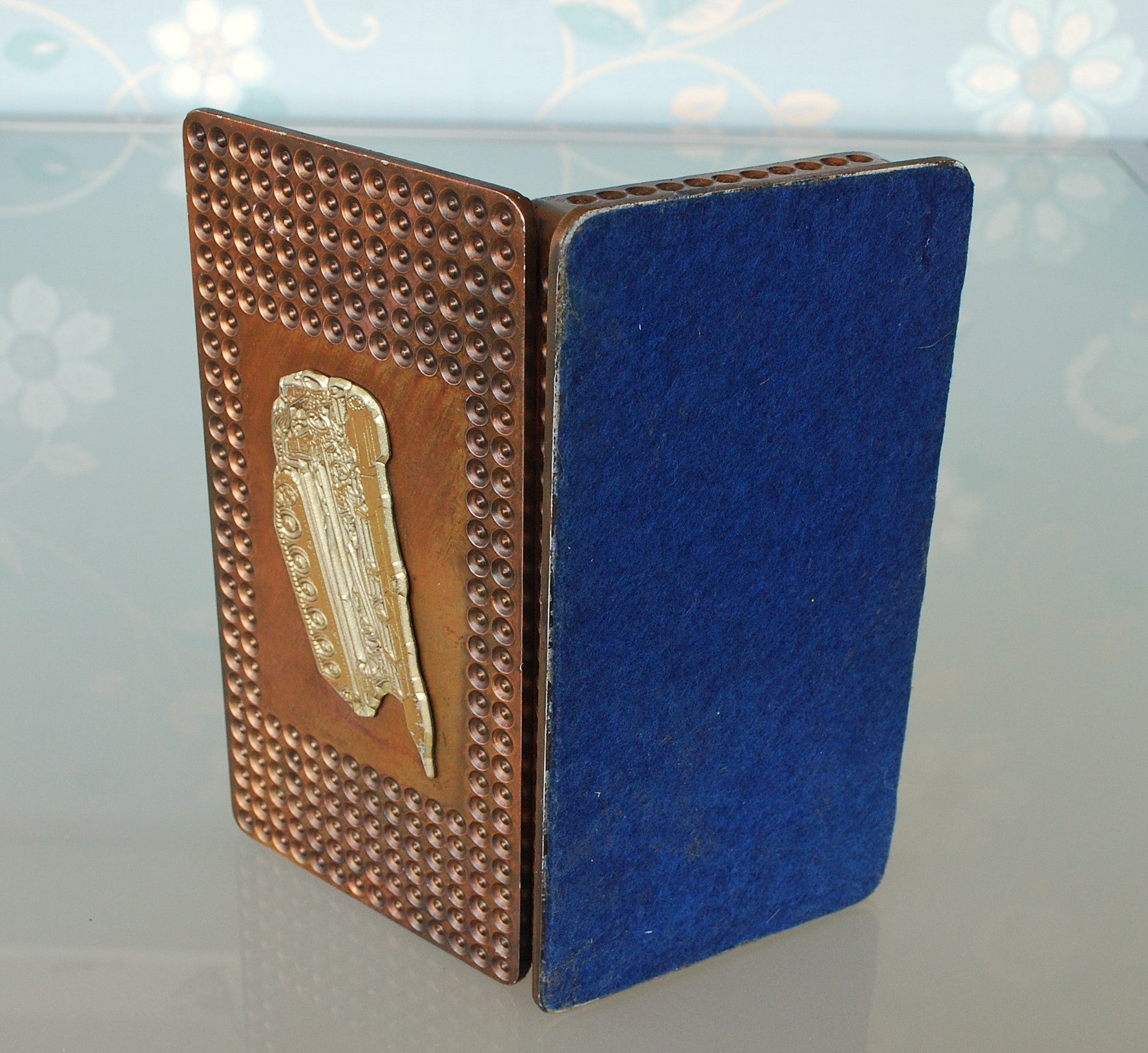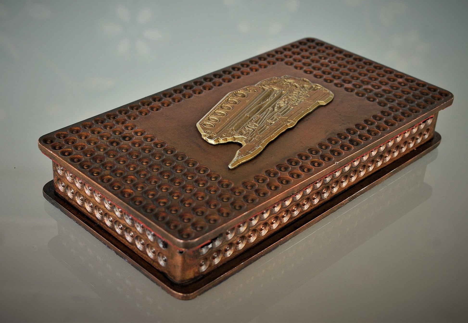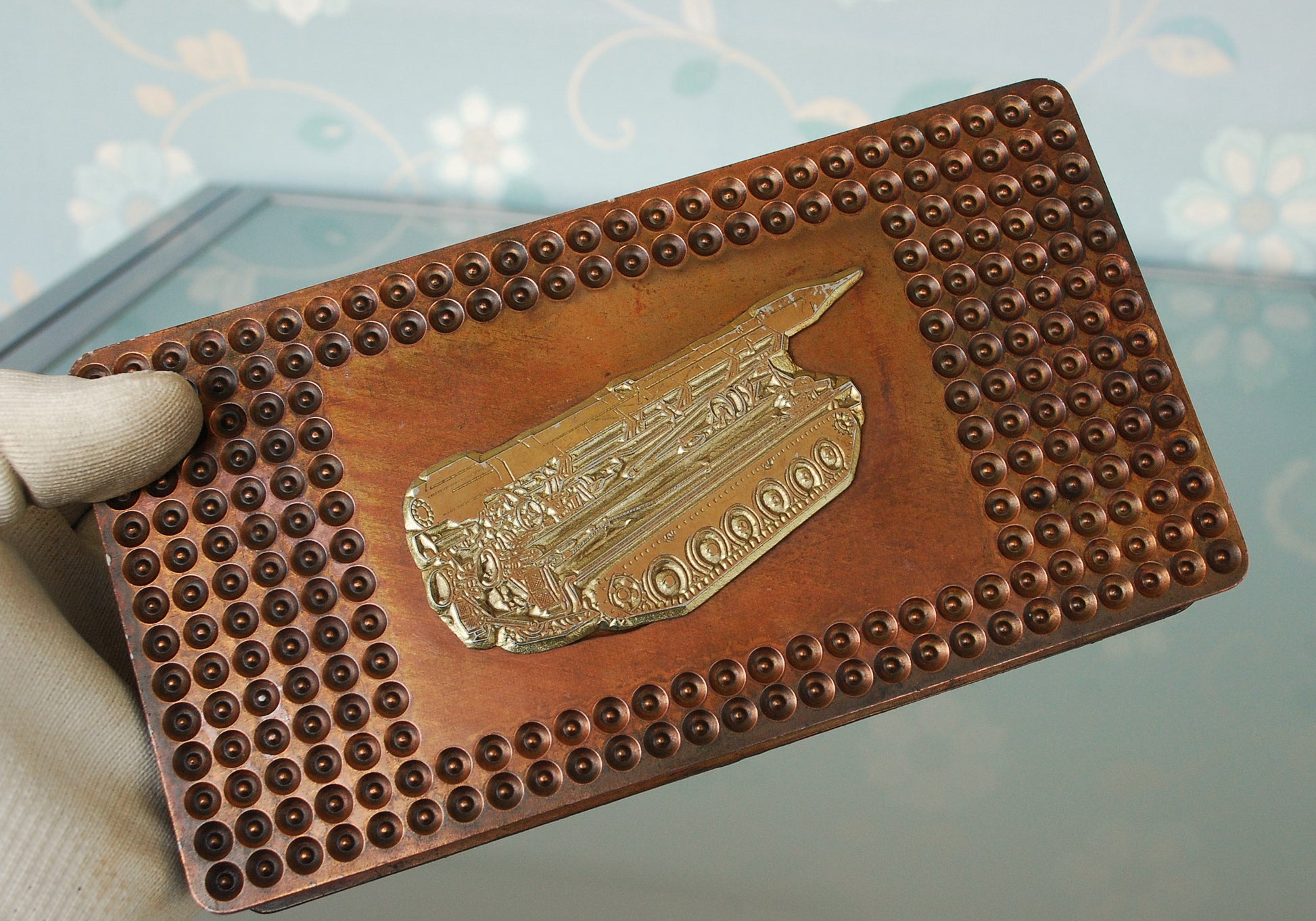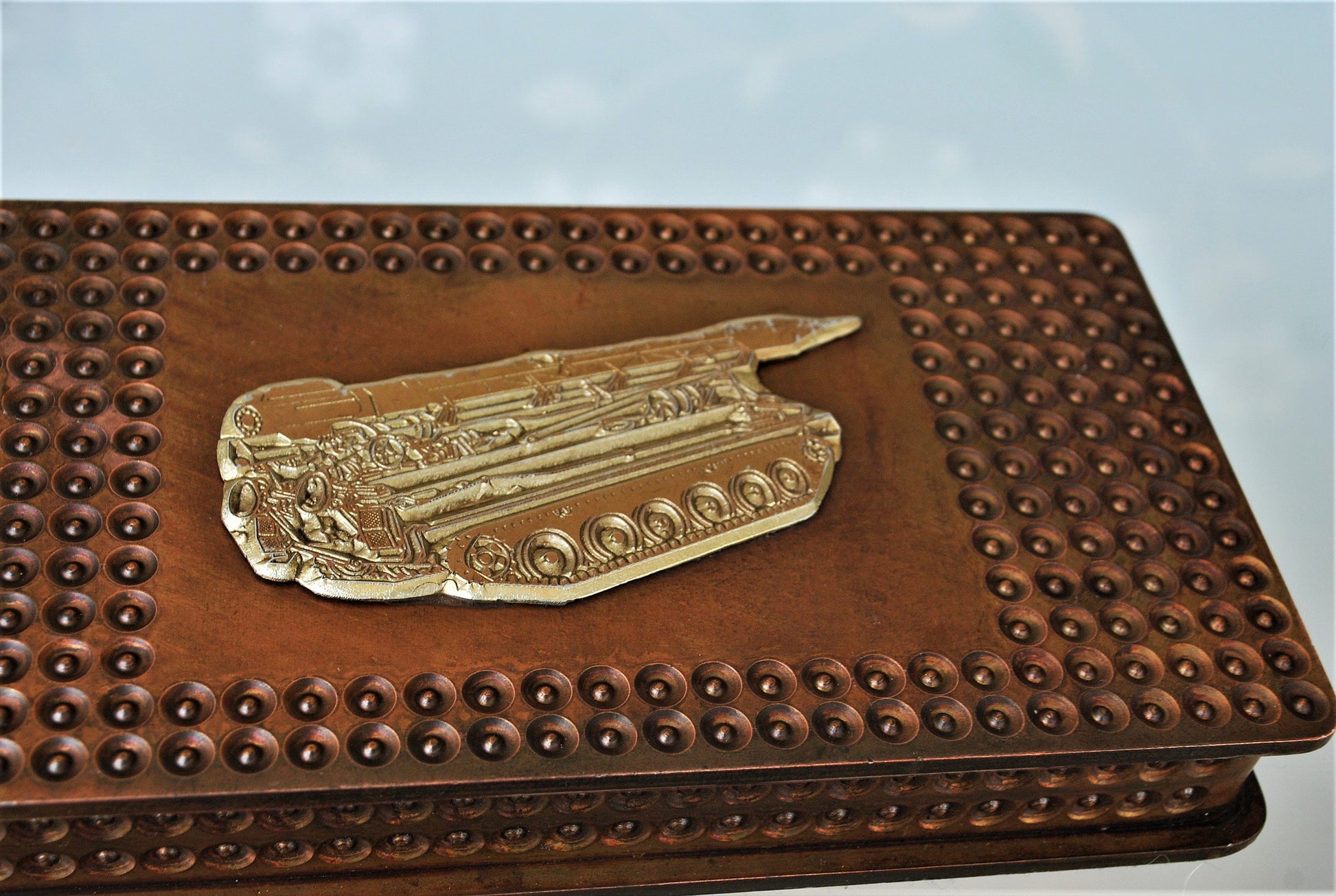 Op de deksel een reliëf van de tank met raket.