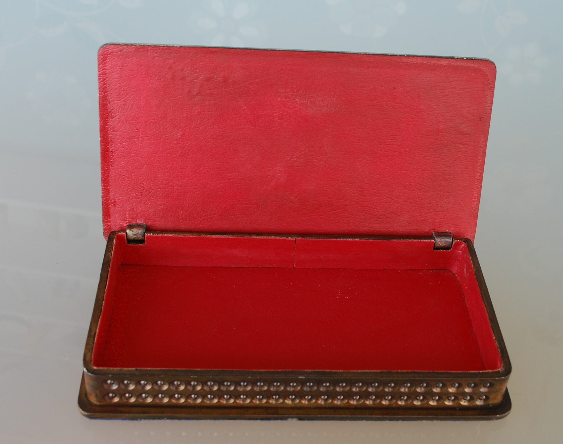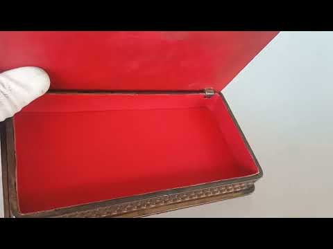 Kistje is van binnen bekleed met rode skai en heeft onder een vilt laag.