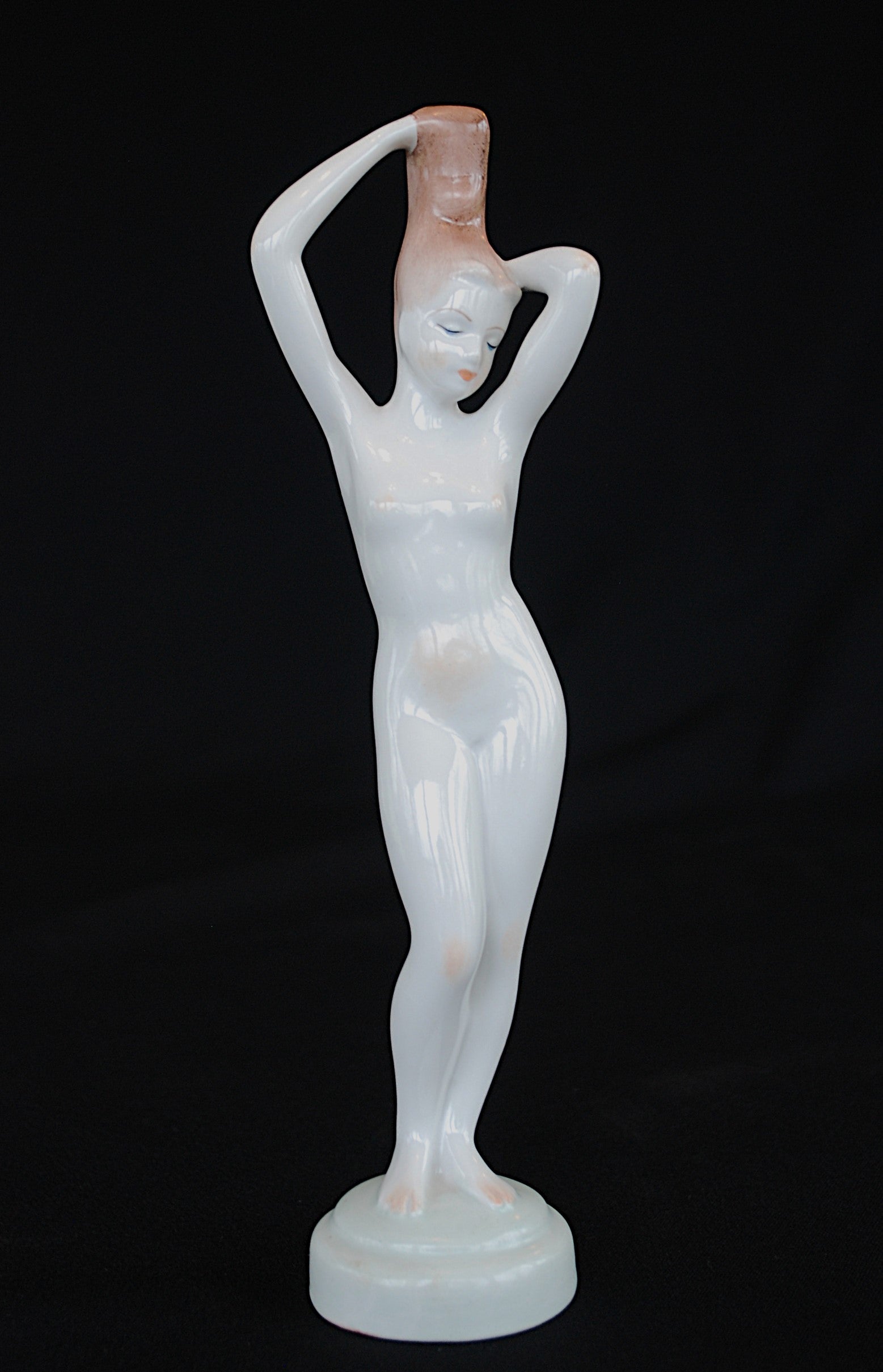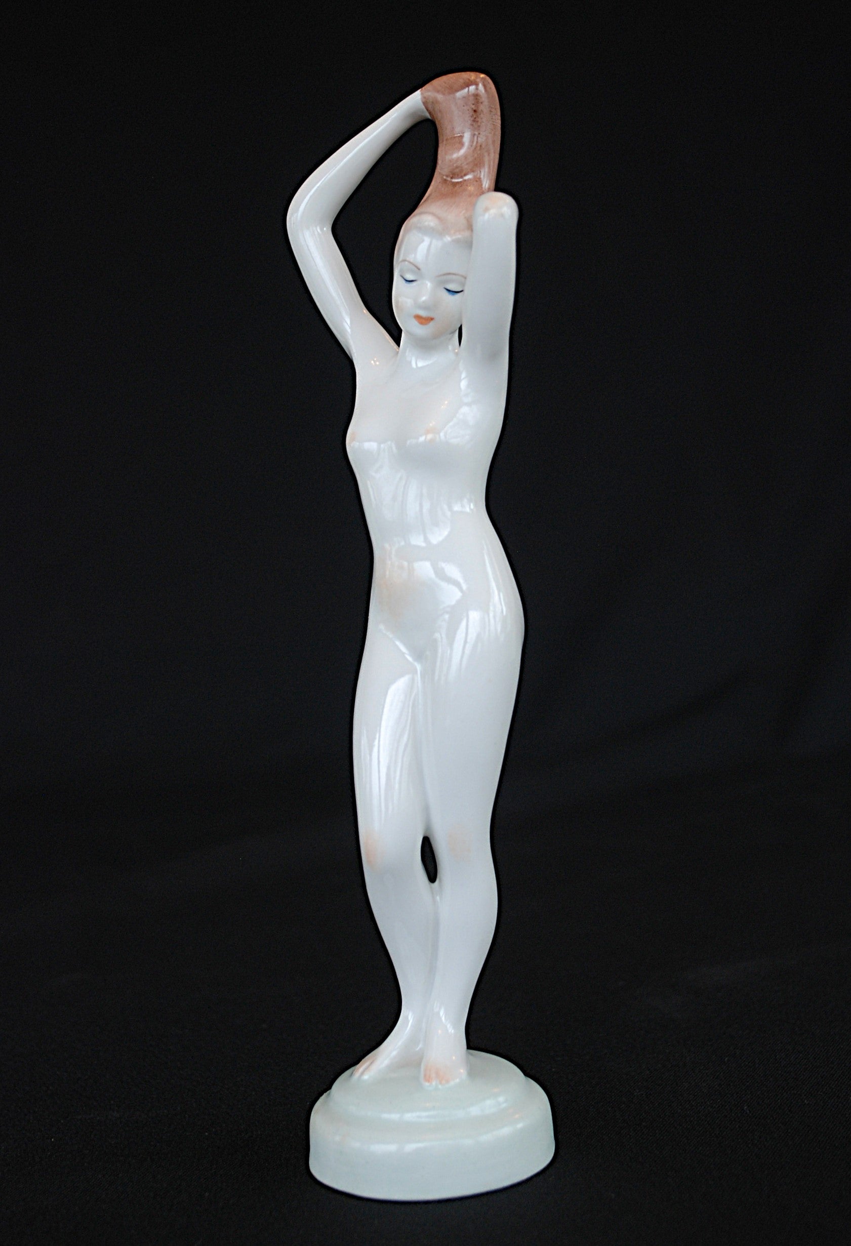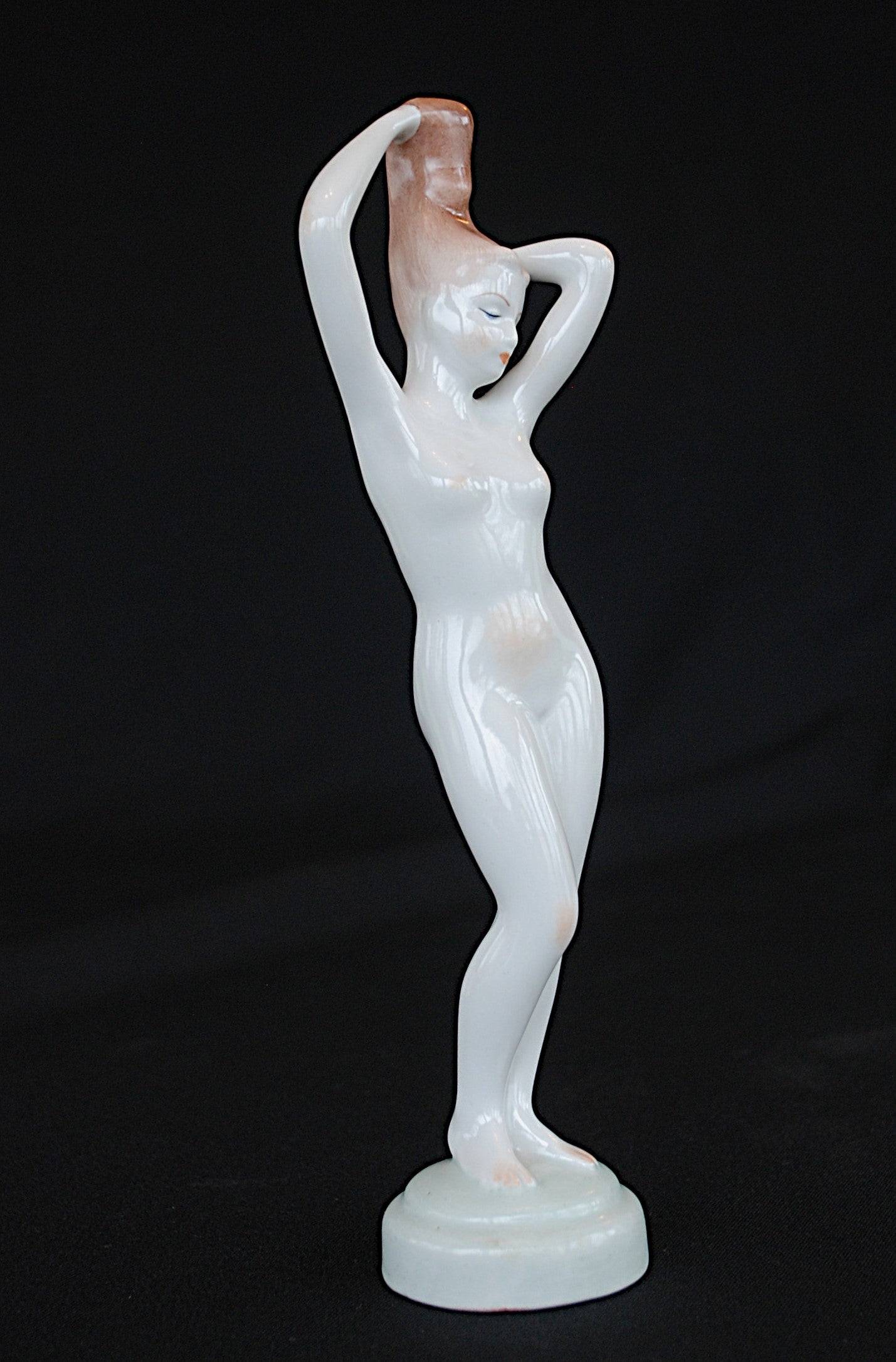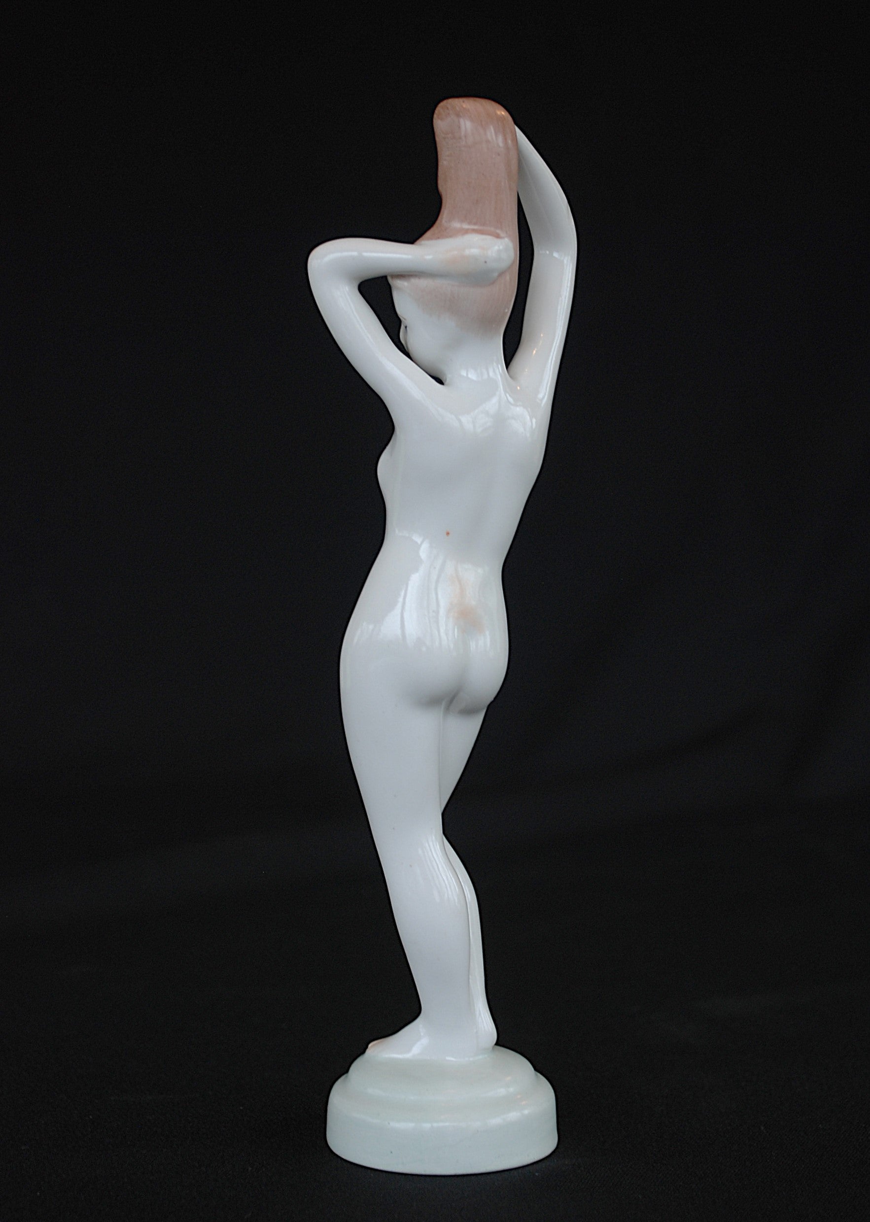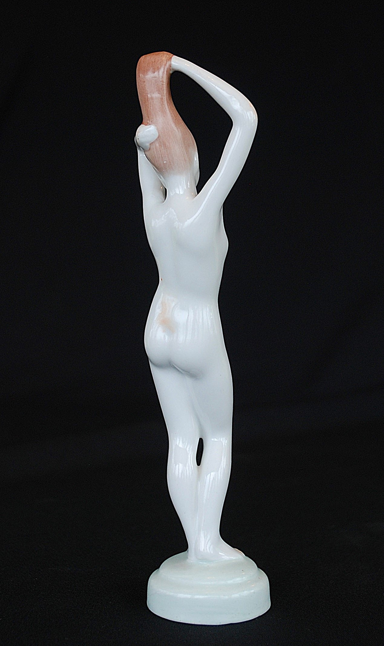 Naakt Vrouw staand met handen in het haar haren. Beeld