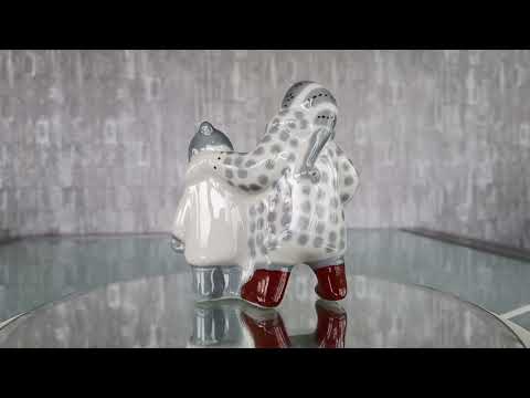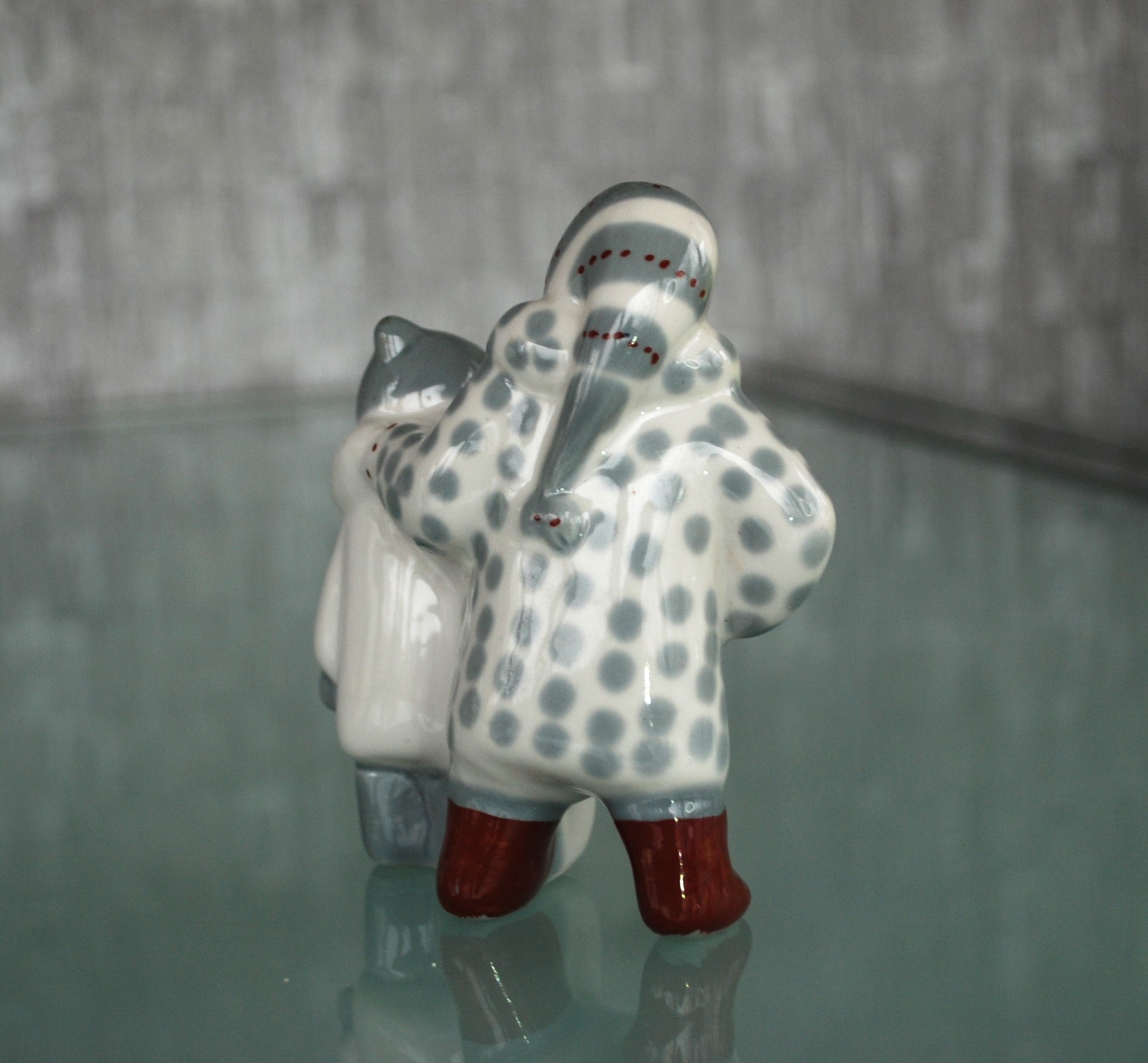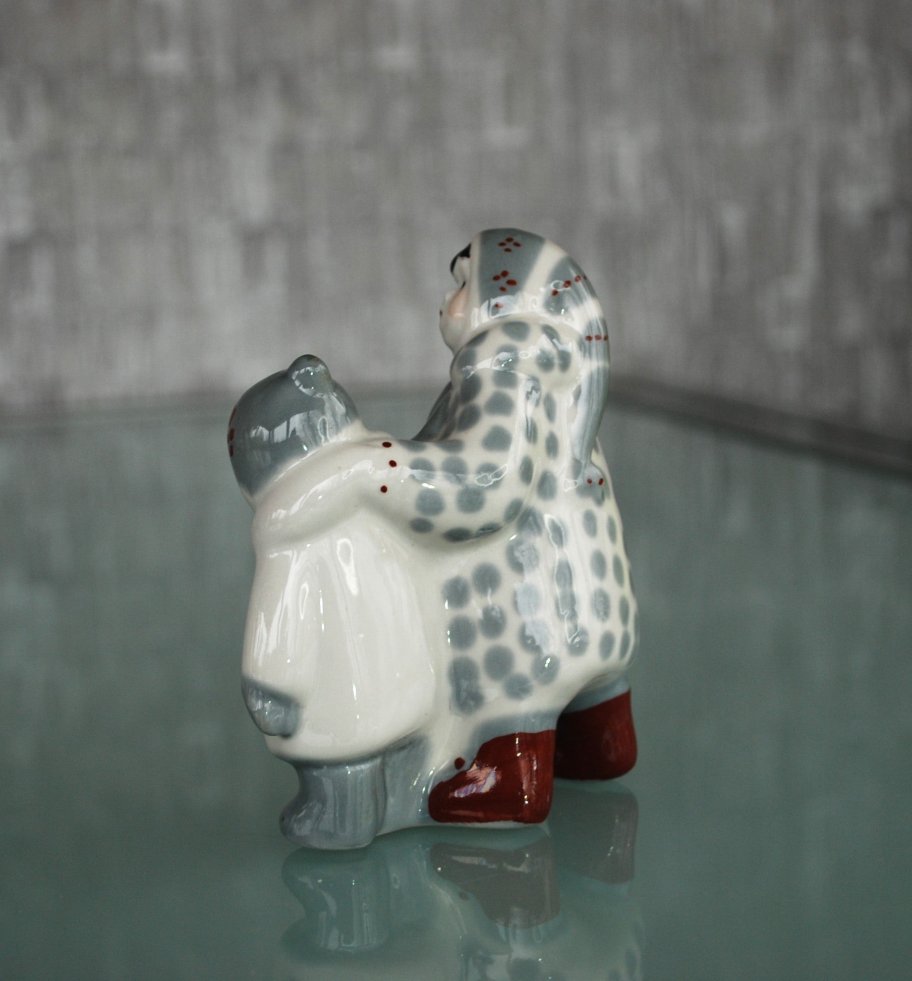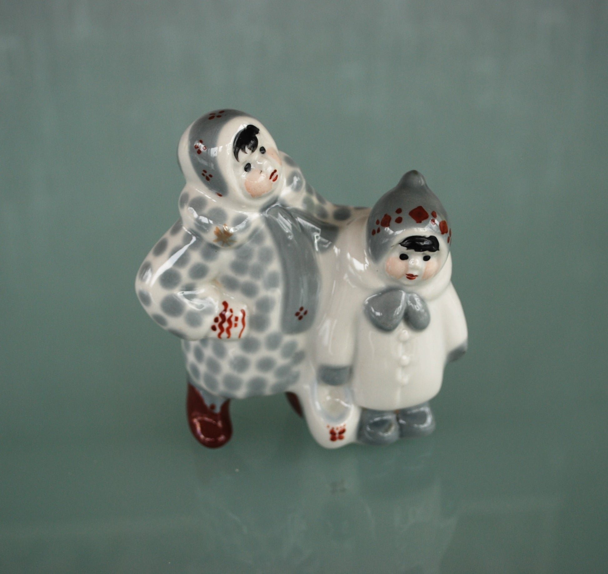 Porselein winter beeld van 2 dik aangeklede kinderen.