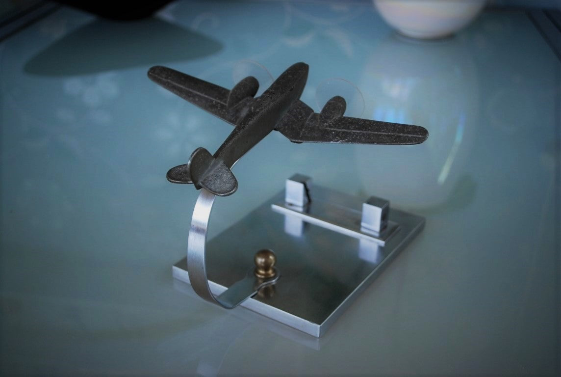 Aluminium vliegtuig op chroom voetstuk met inscriptie en datum 4-12-1949