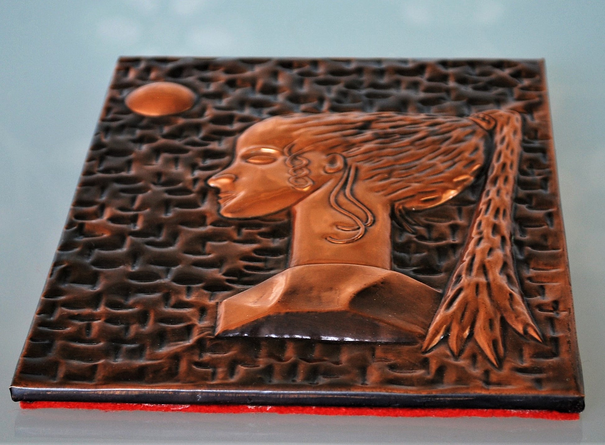 Koper stilistisch Reliëf van een jonge vrouw.