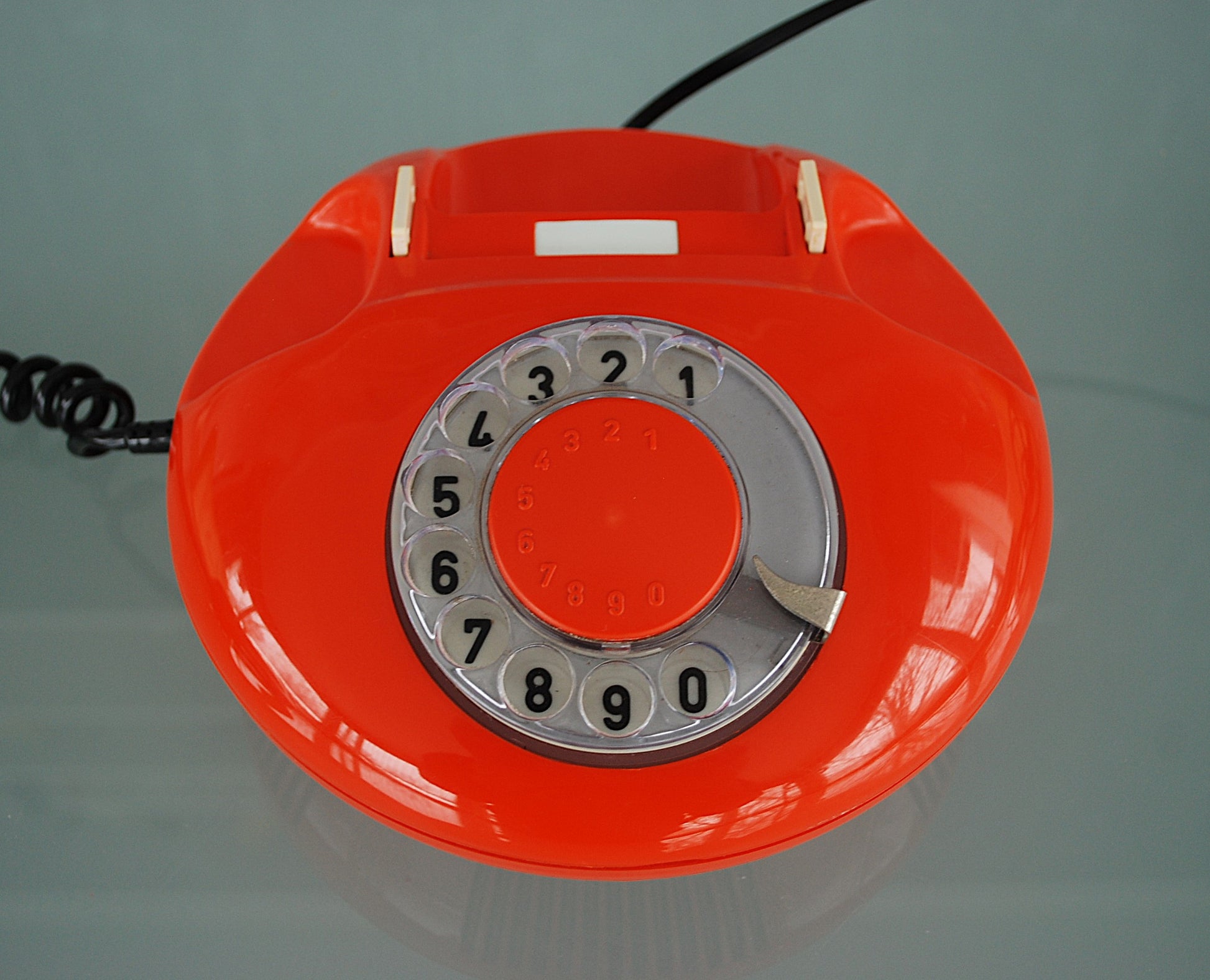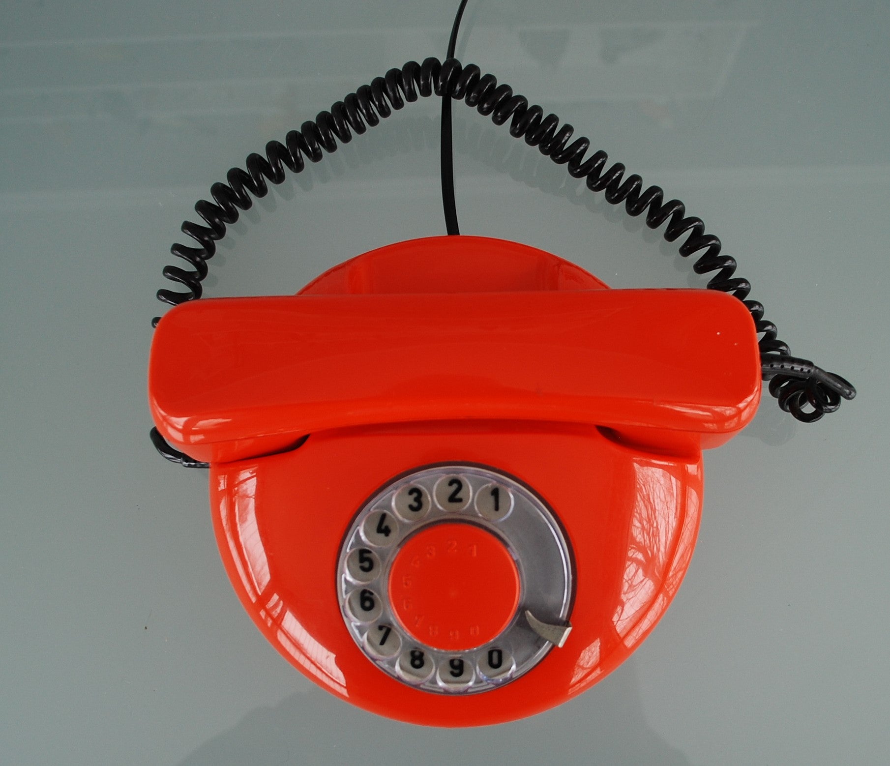 Tesla draaischijf telefoon uit de jaren 70 ruimtetijdperk, Tsjecho-Slowakije, atoomtelefoon, Glimmend oranje kleur telefoon in super staat, zo retro.