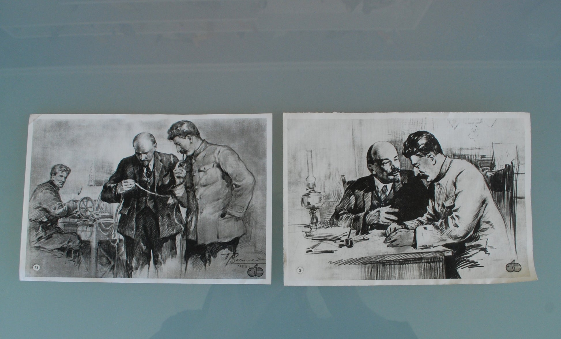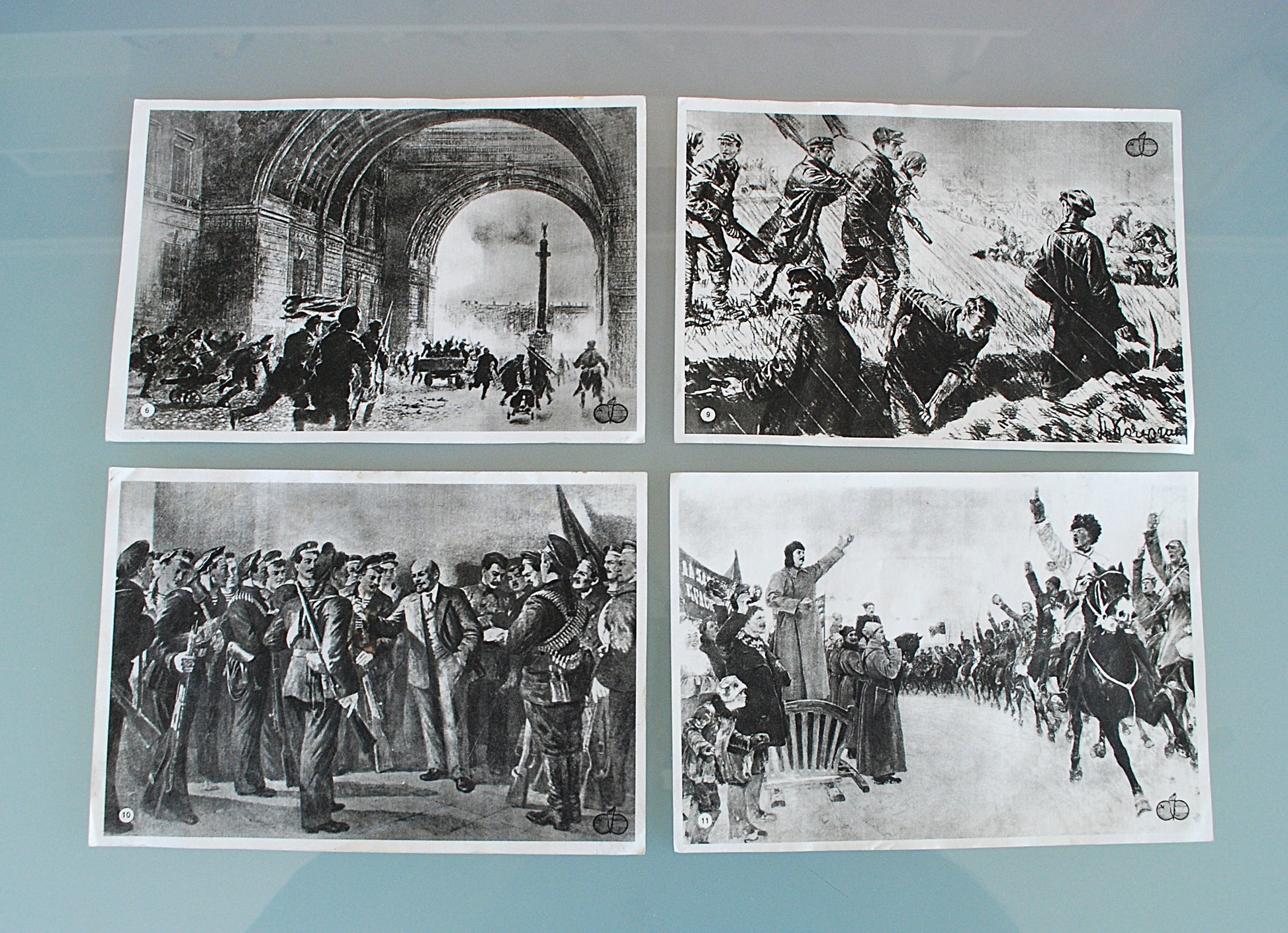 Oude prints, set van 1 tot en met 14 met afbeeldingen van Lenin, Stalin en de oktober revolutie van 1917.