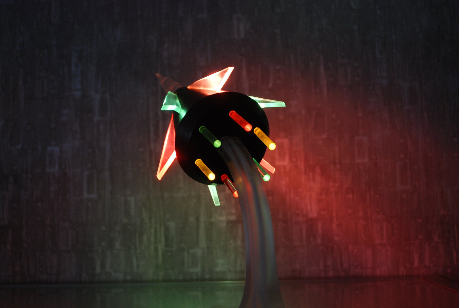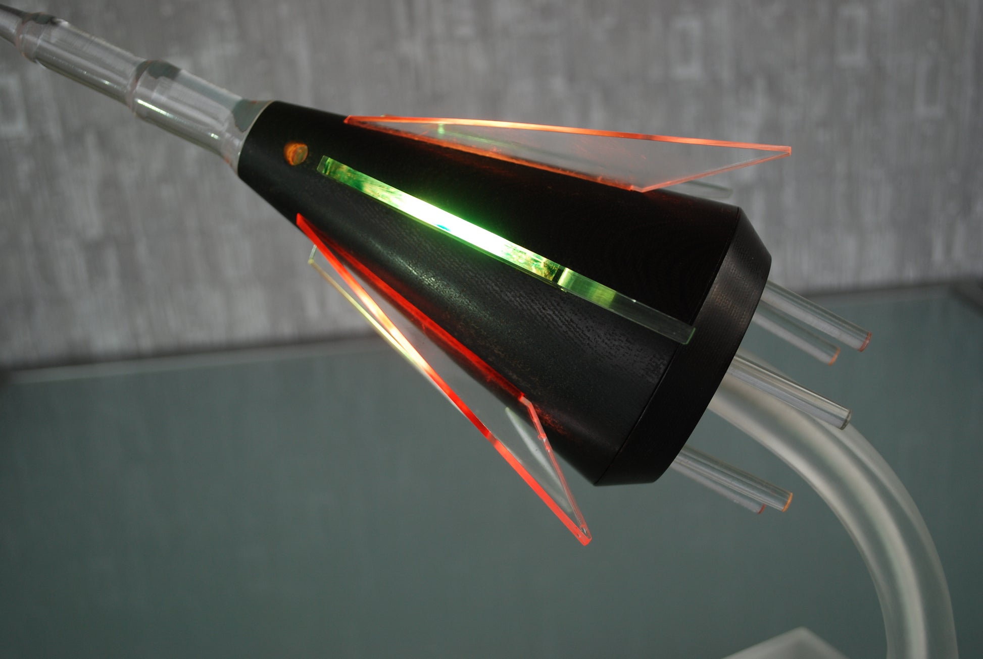 Capsule staat op een zijdemat plexiglas voet en heeft een pertinax body met 3 rode en 3 groene vleugels.