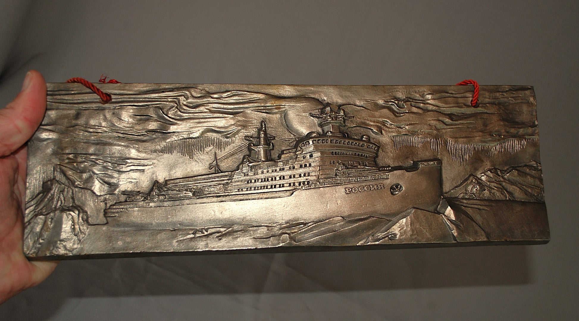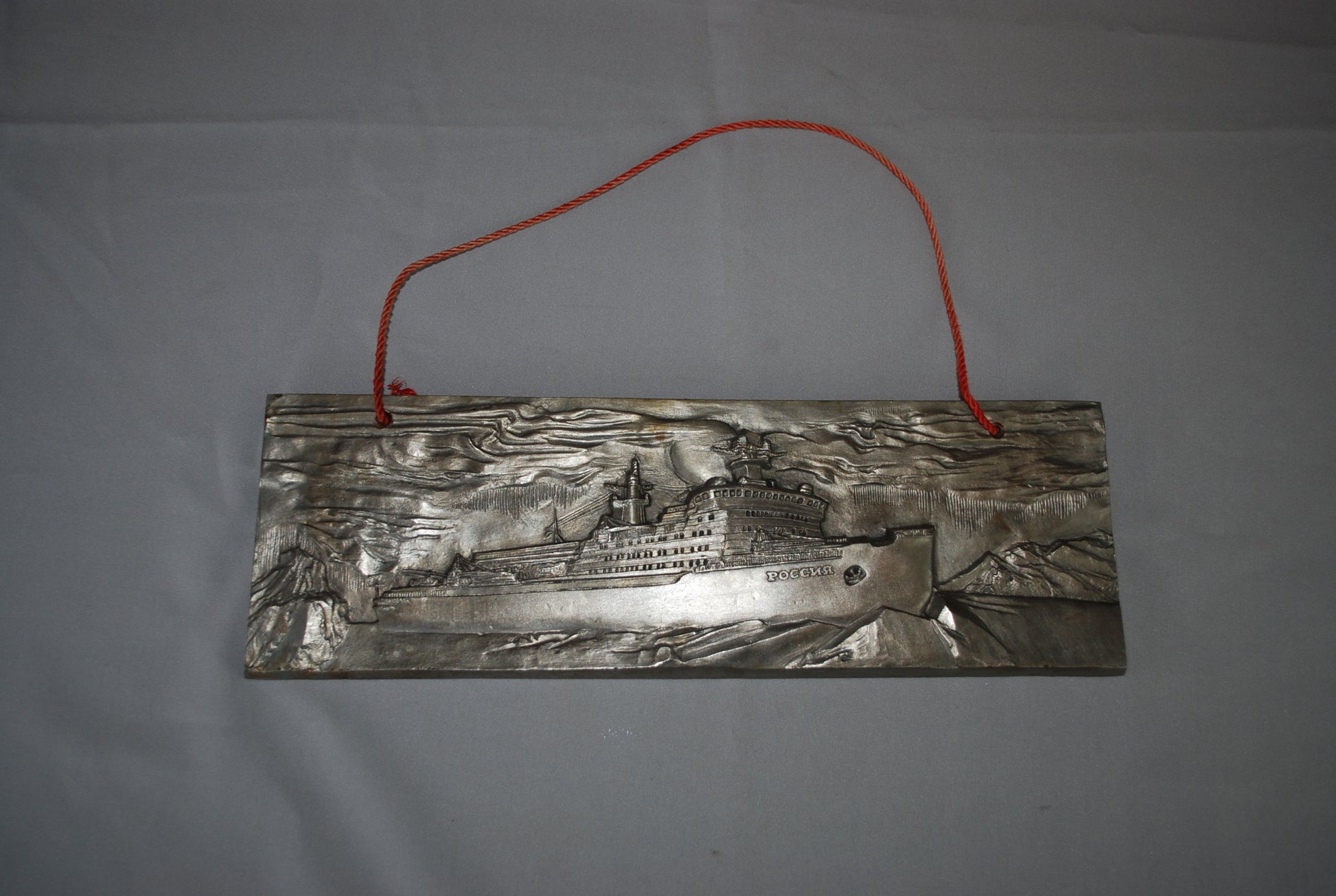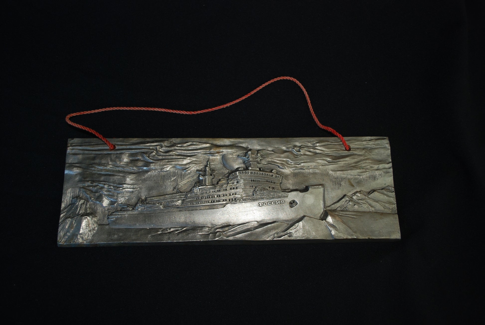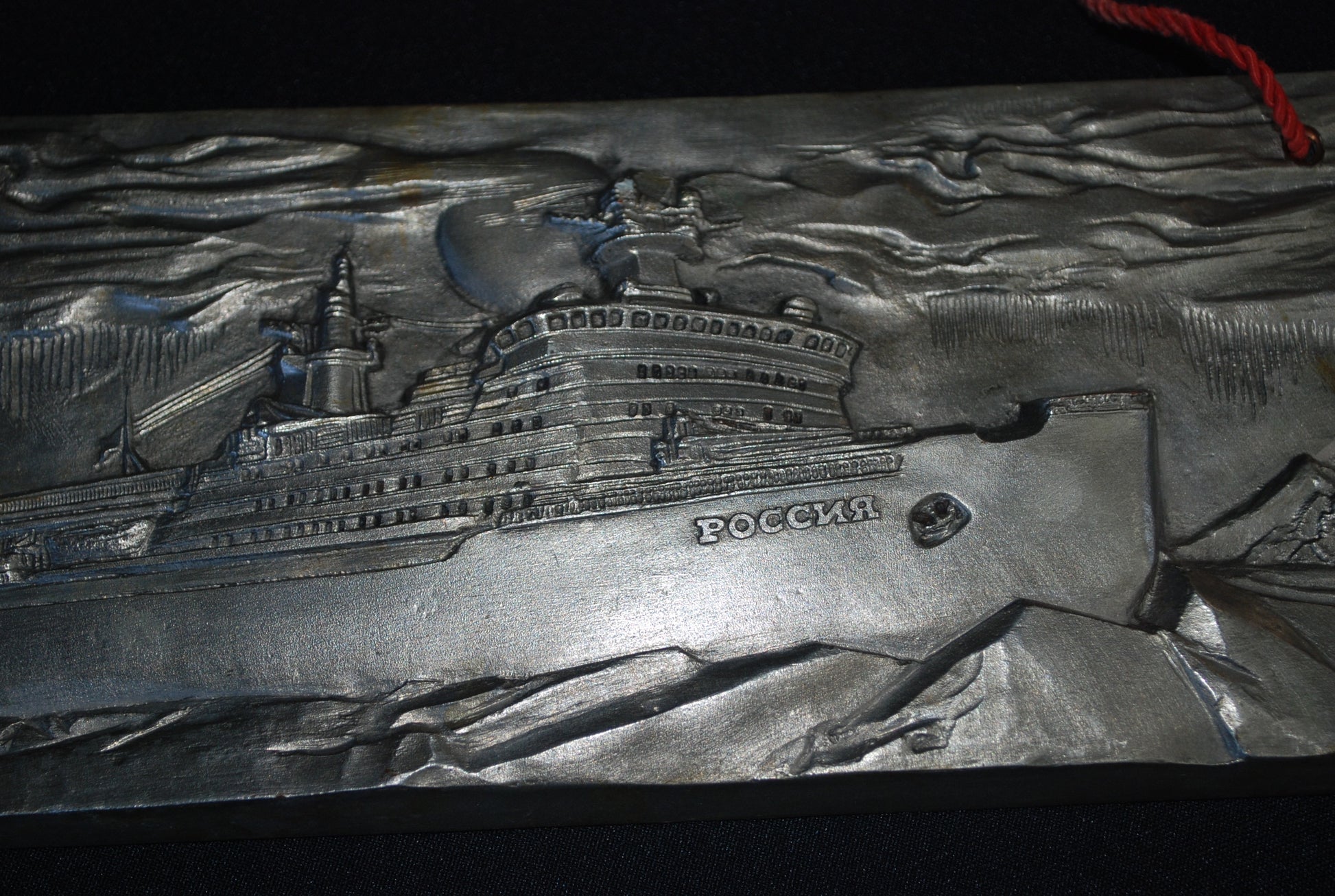 Reliëf van een ijsbreker genaamd "Rossiya" (Россия), wat "Rusland" betekent in het Russisch.