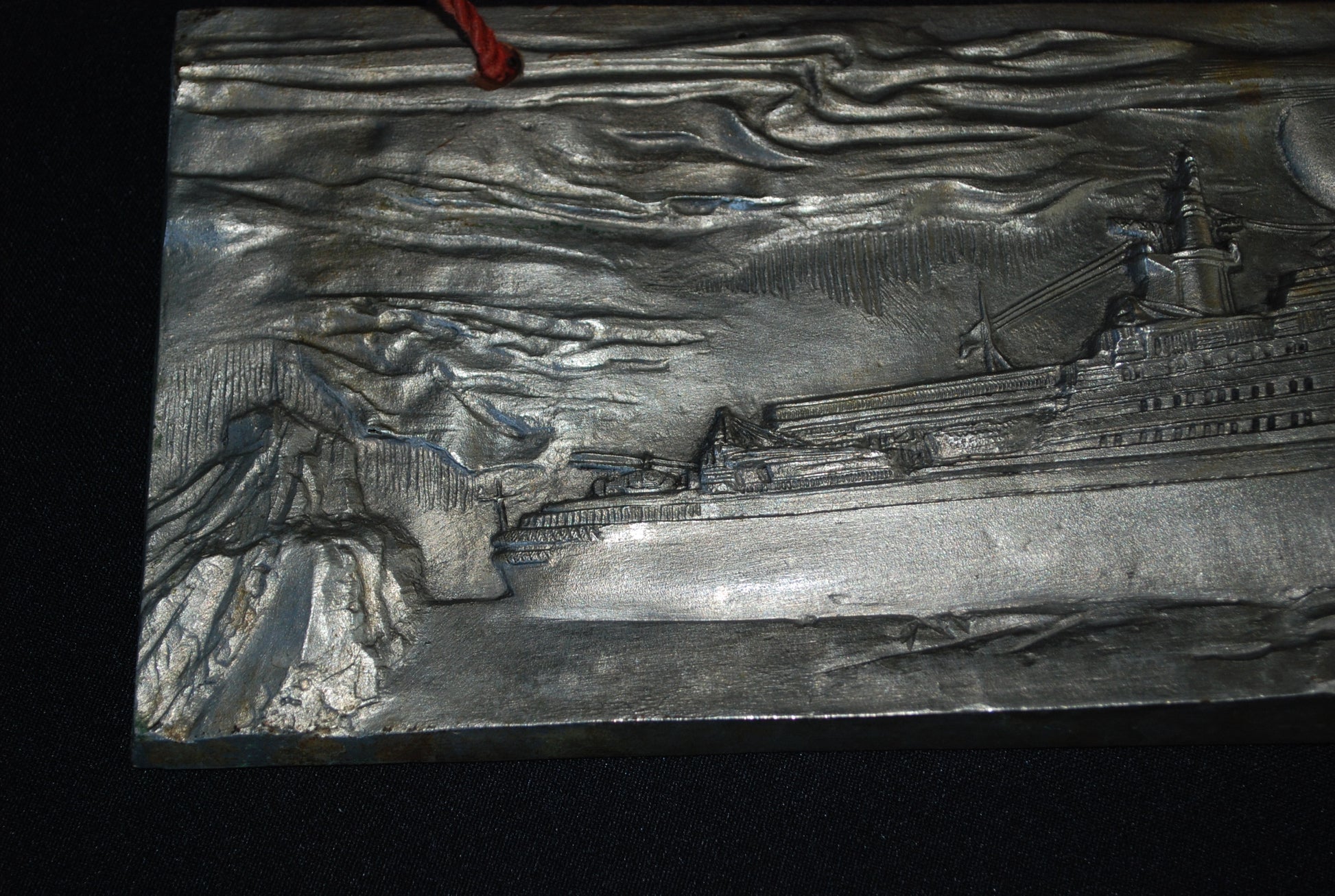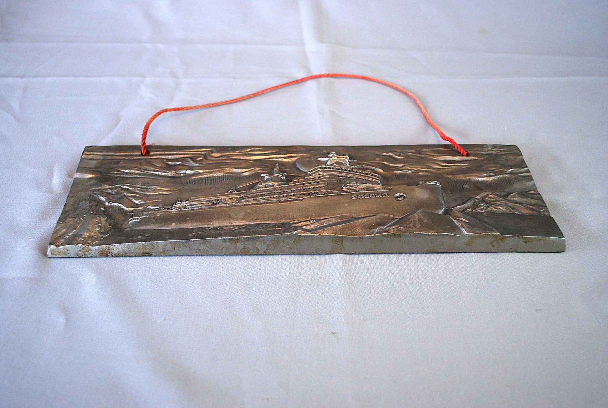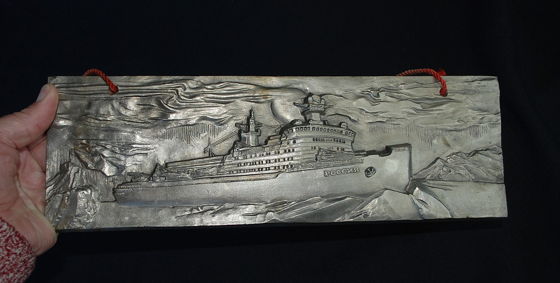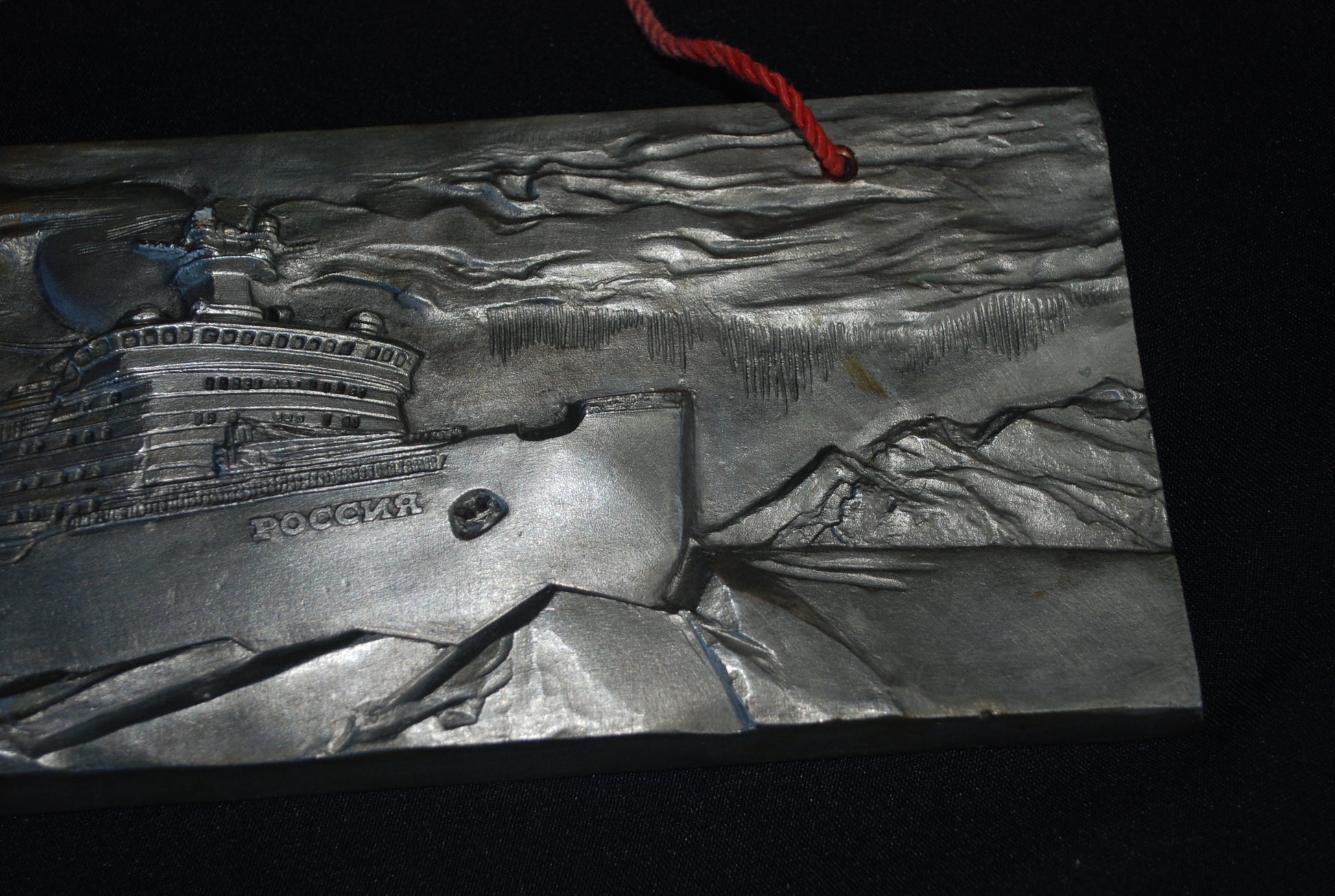 Reliëf van een ijsbreker genaamd "Rossiya" (Россия), wat "Rusland" betekent in het Russisch.