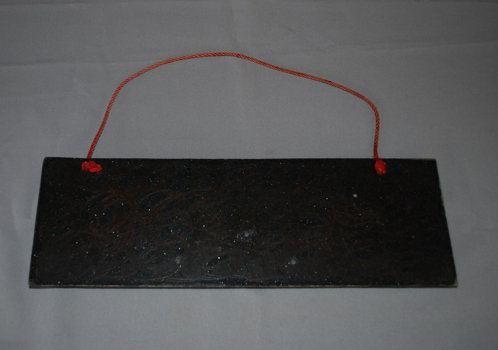 Het materiaal van metaal en aan de achterkant van kunststof met een rode koord om het aan op te hangen.
