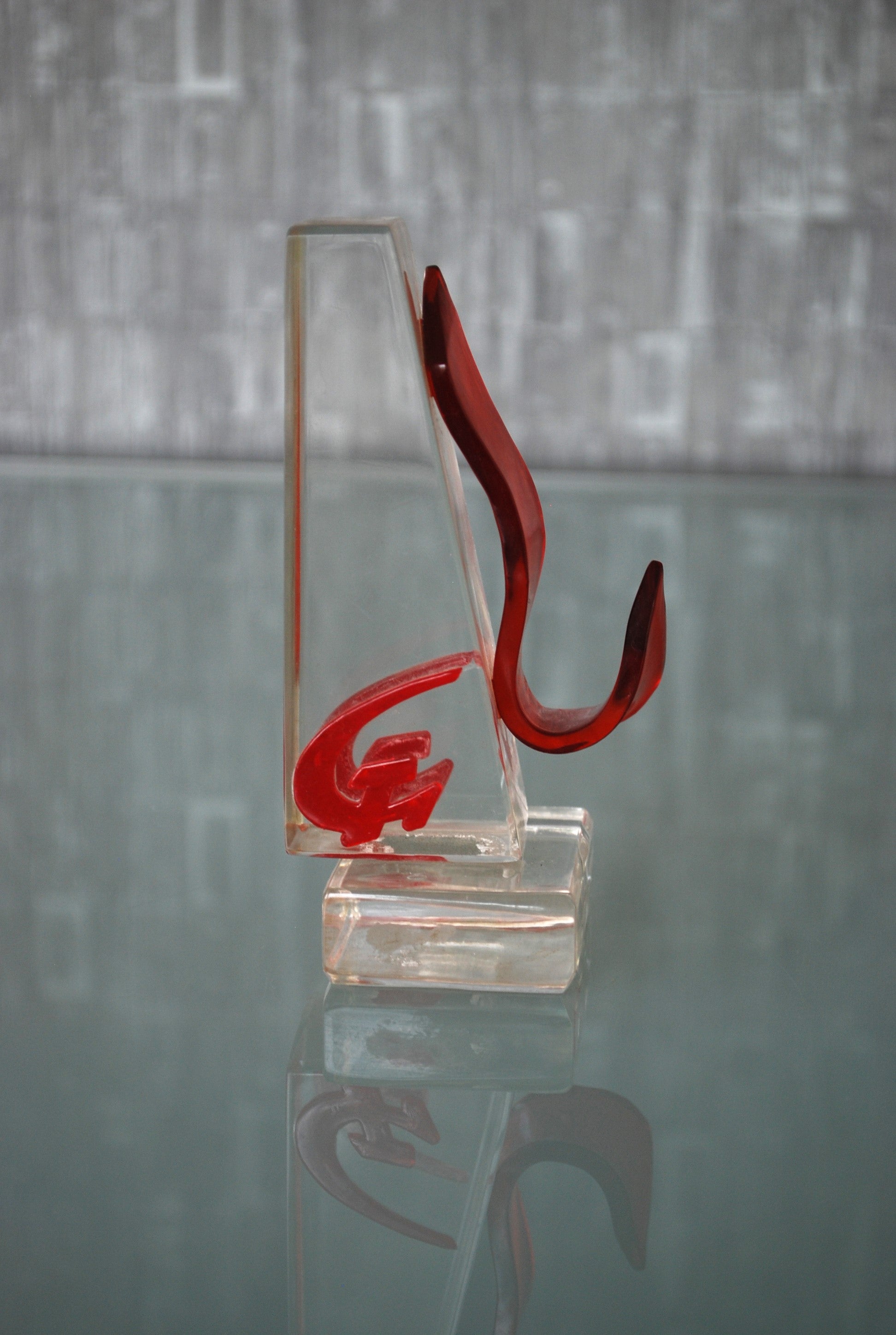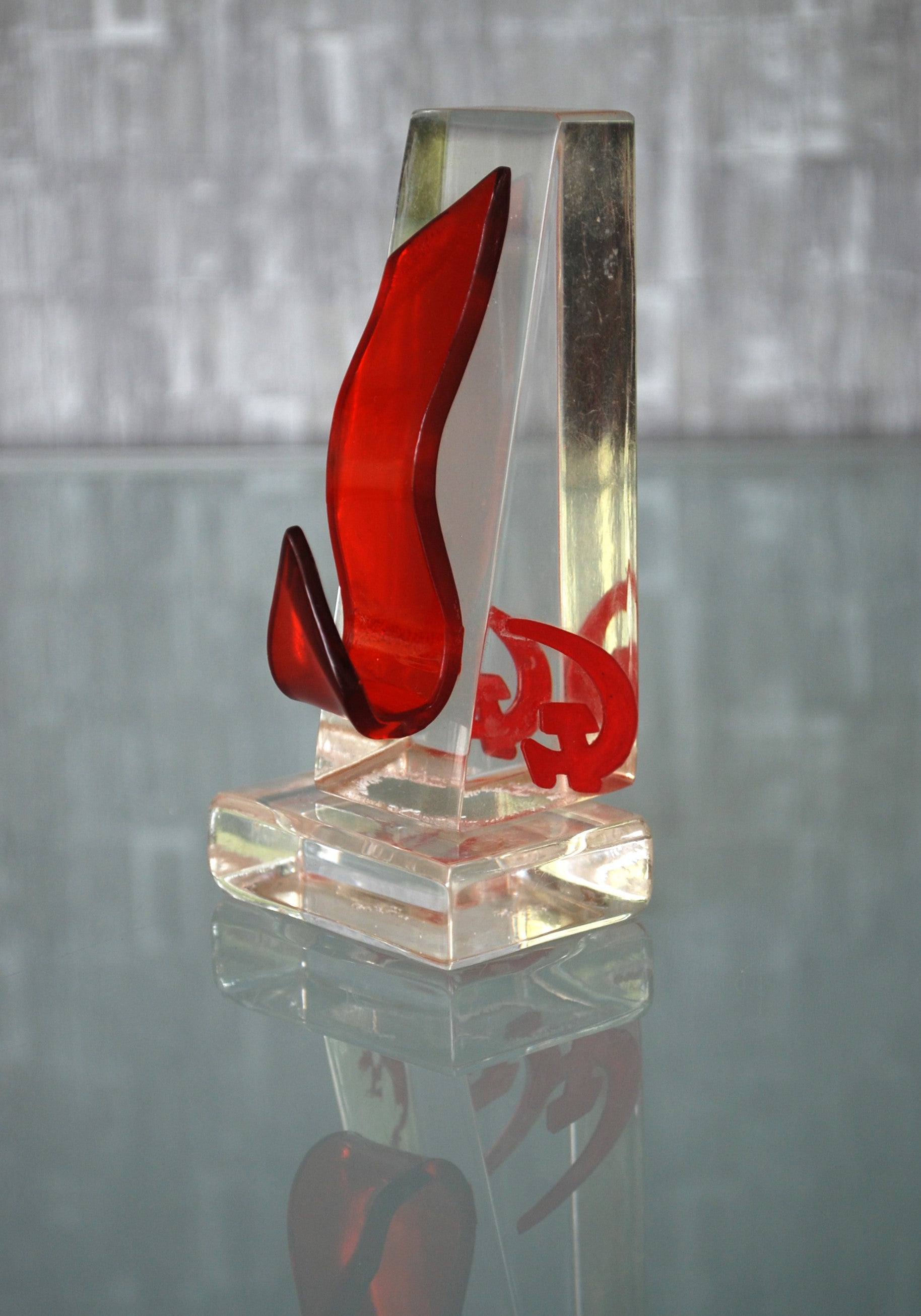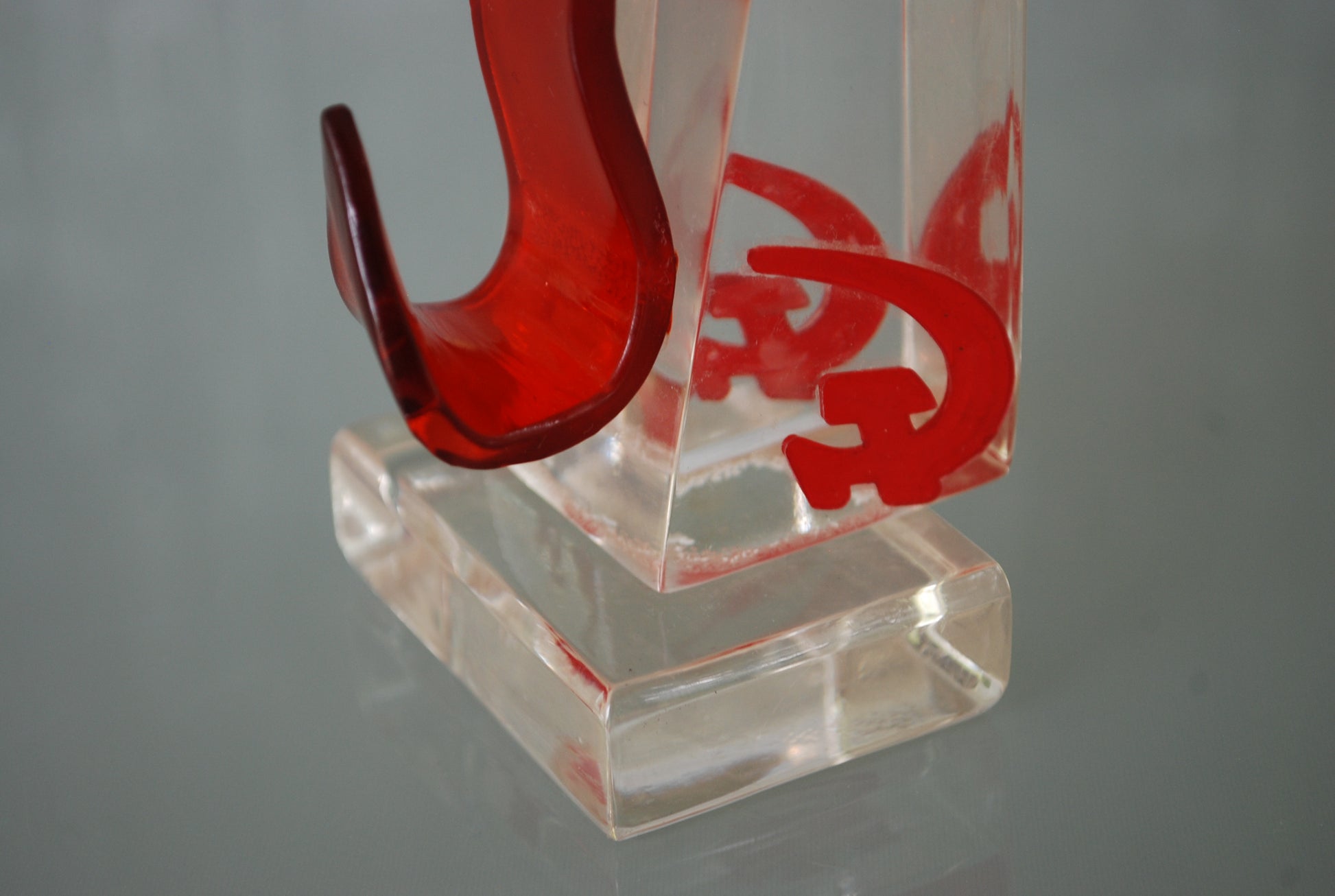 Sprankelende ornament van transparant plexiglas met rode lint en 2 x hamer en sikkel