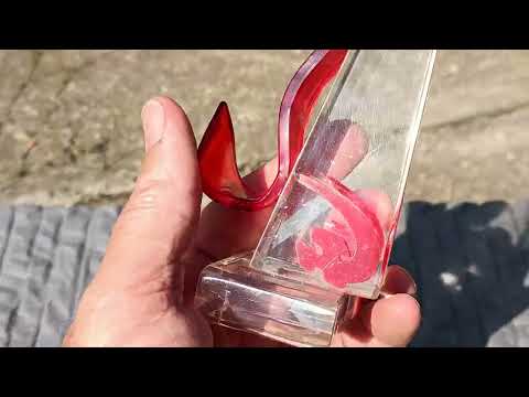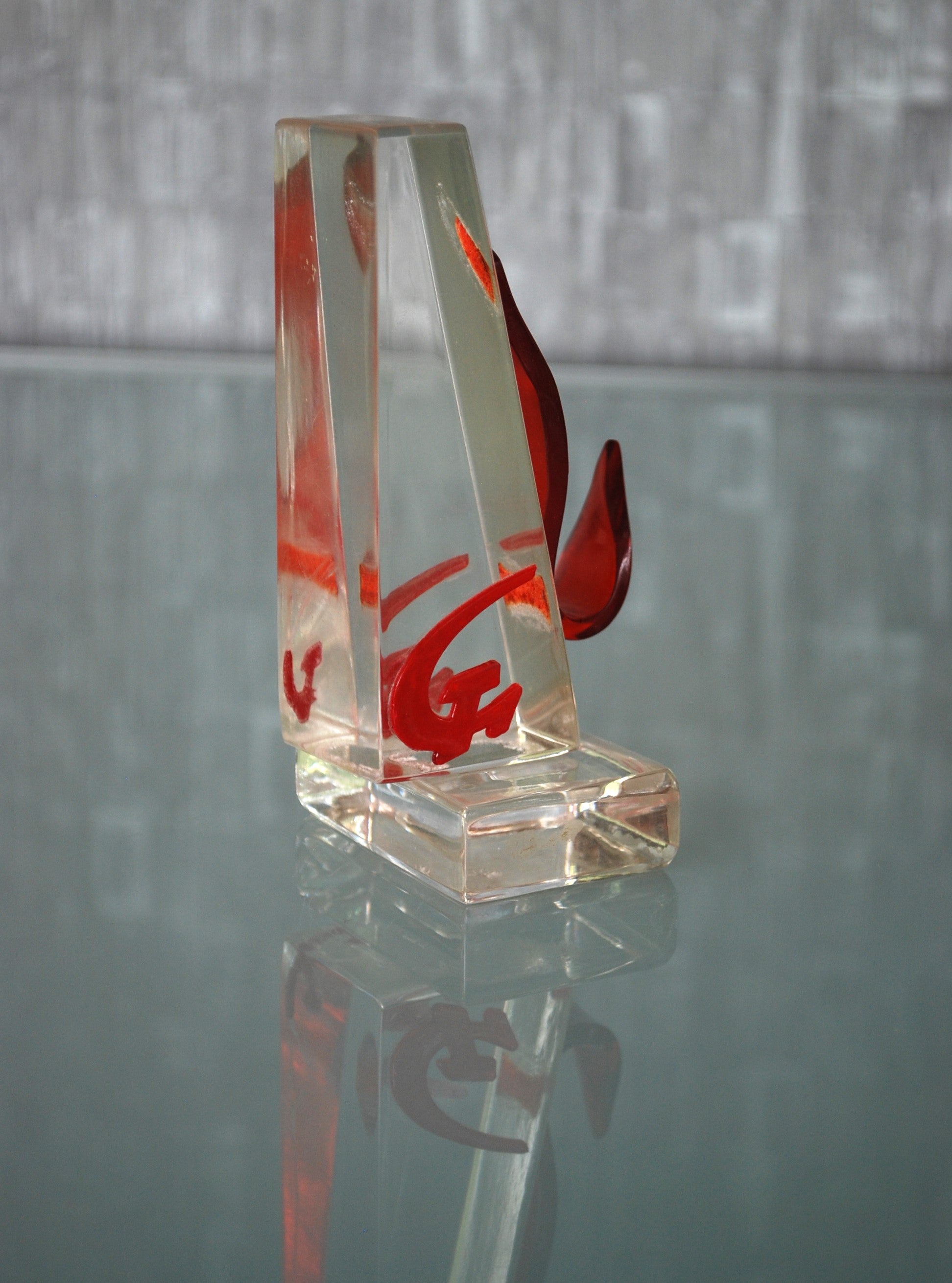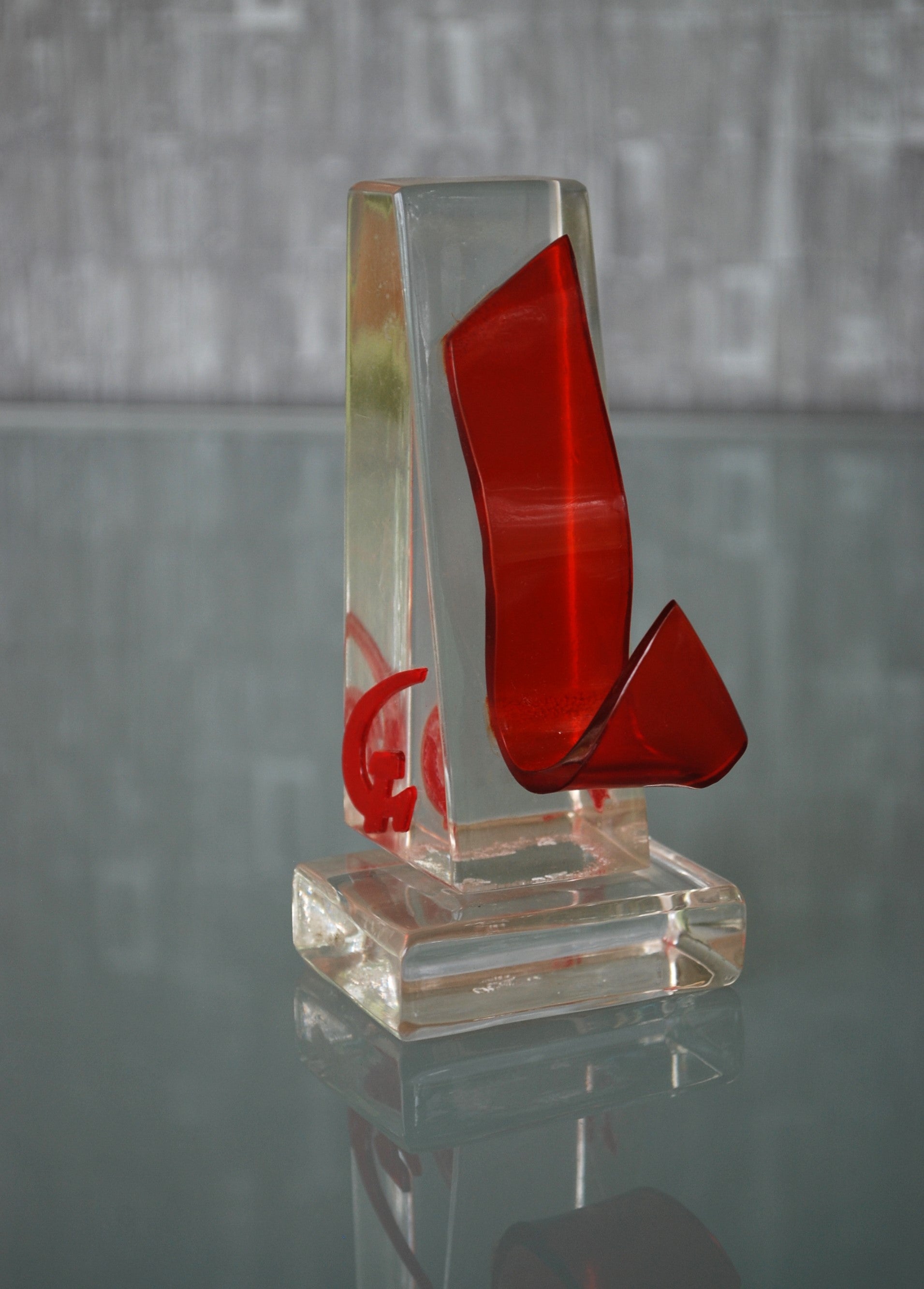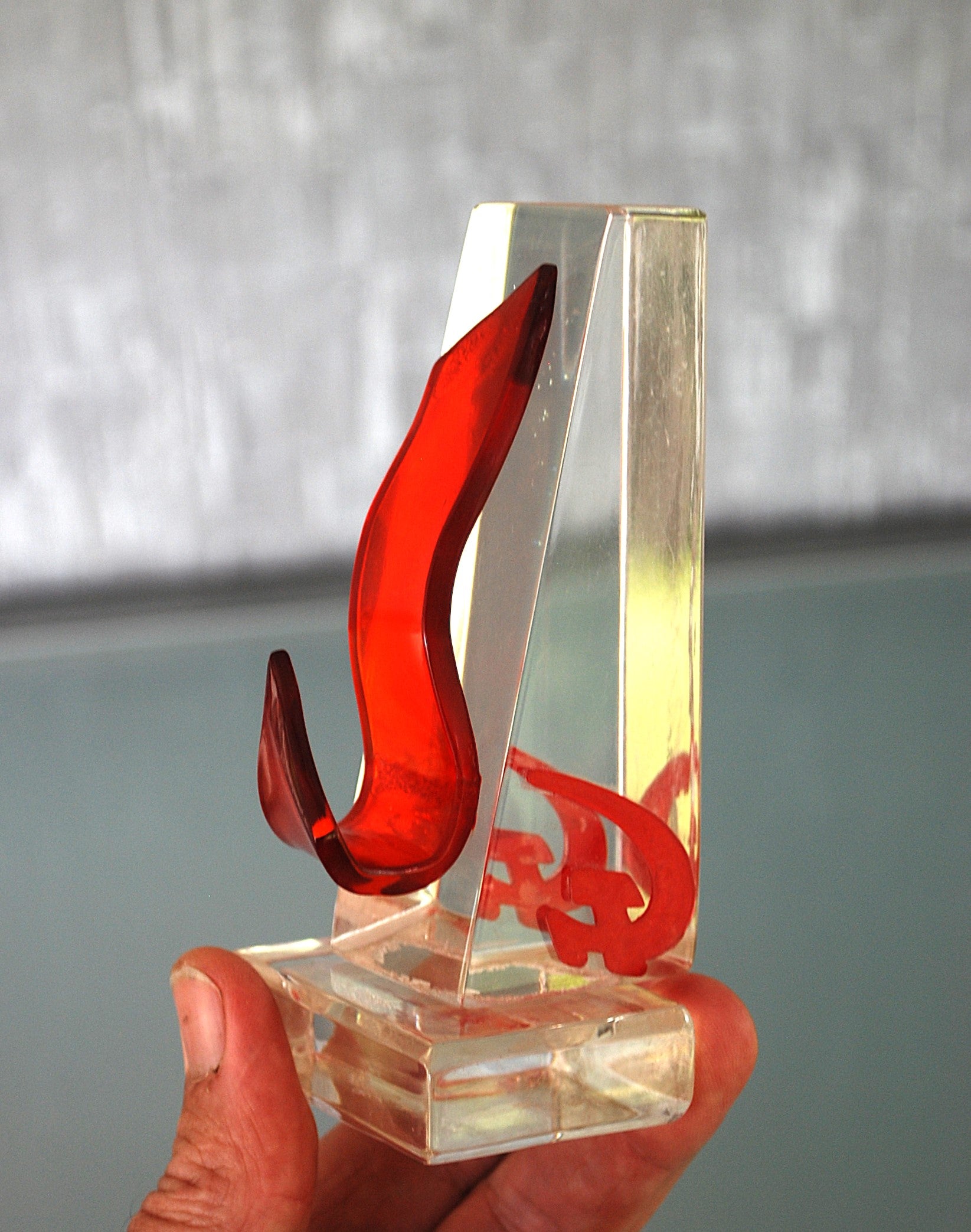 Sprankelende ornament van transparant plexiglas met rode lint en 2 x hamer en sikkel