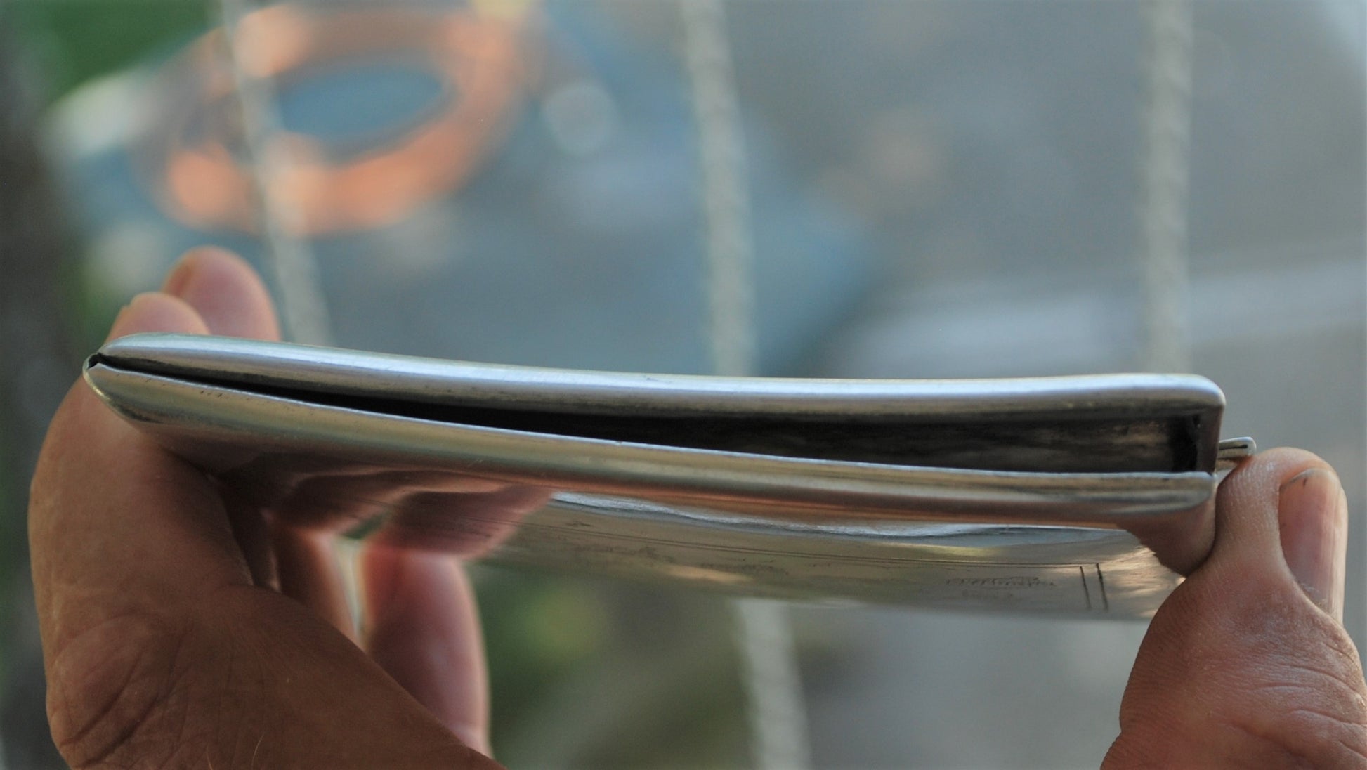 Glanzend aluminium met een holle vorm om perfect in de achter broekzak te passen.