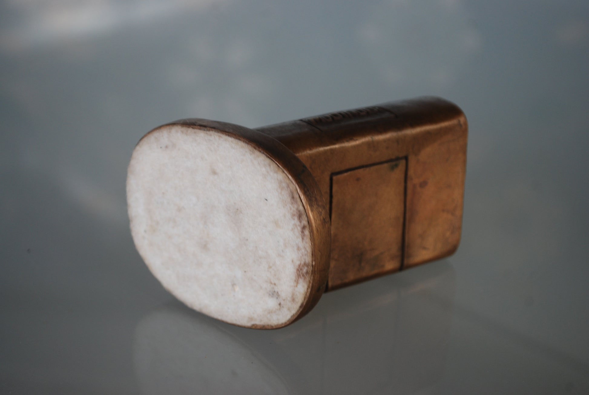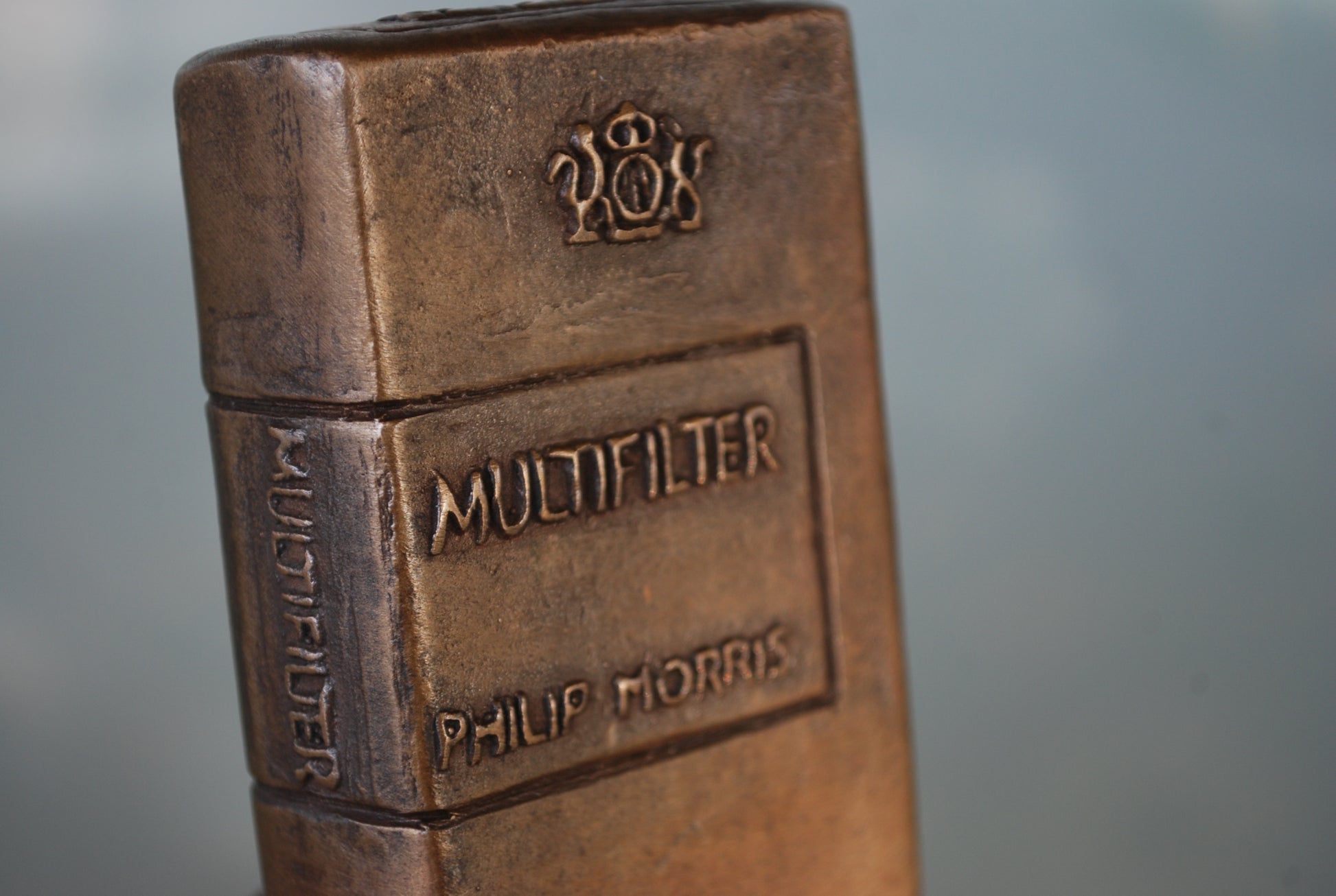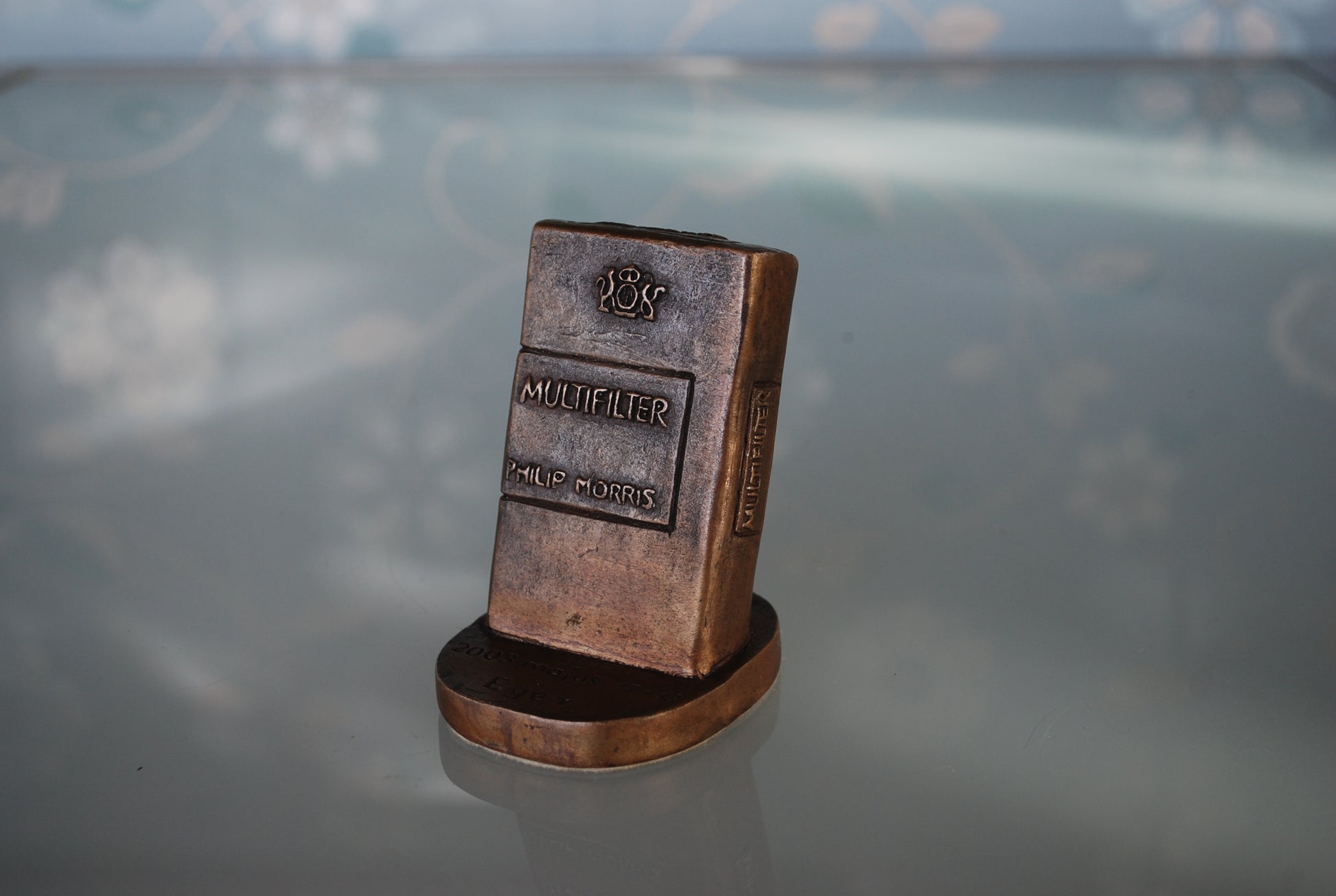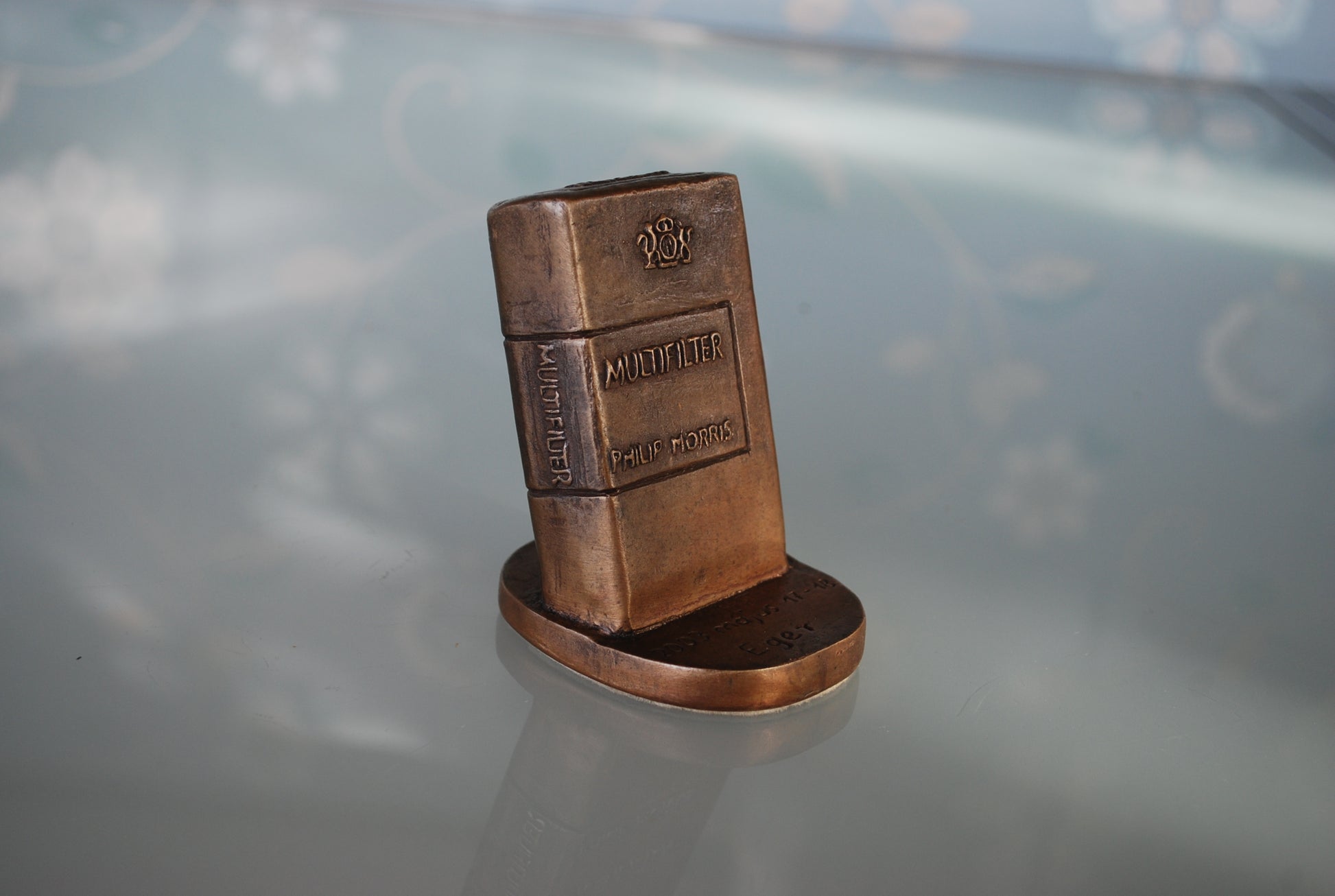 Het heeft de formaat van een echte pakje sigaretten en is gemaakt van brons met mooie patina en van onder bekleed met witte vilt.