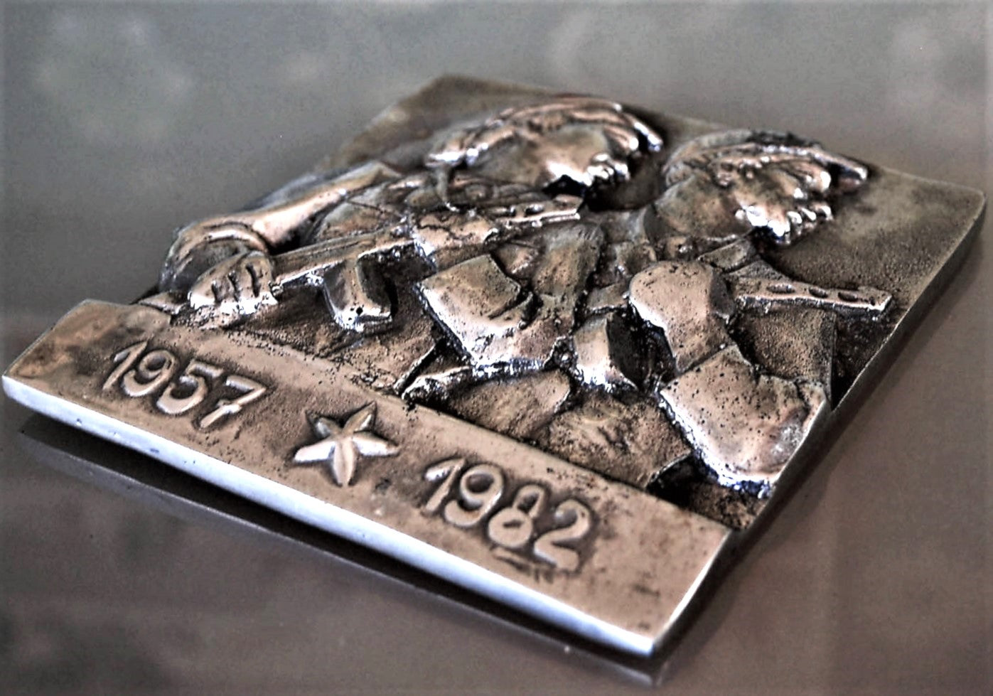 Onderin de 2 jaartallen met de communistische ster ertussen.