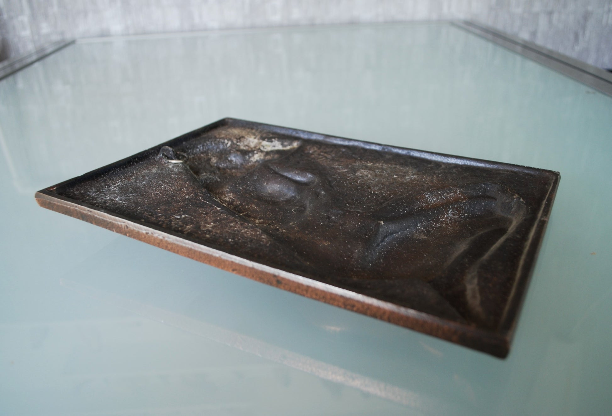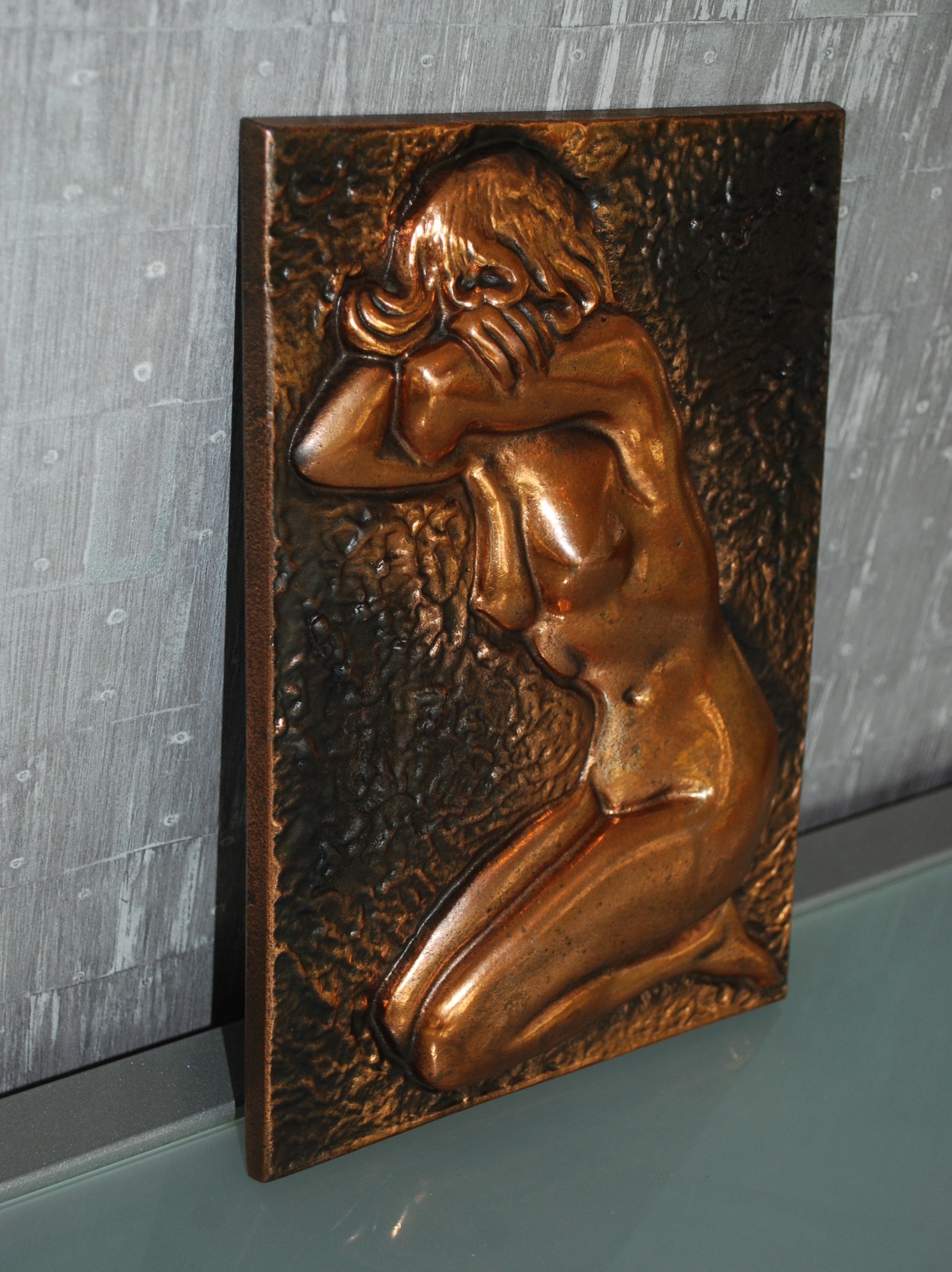 Zwaar reliëf muur ornament van een vrouw op haar knieën met haar hoofd in de armen.
