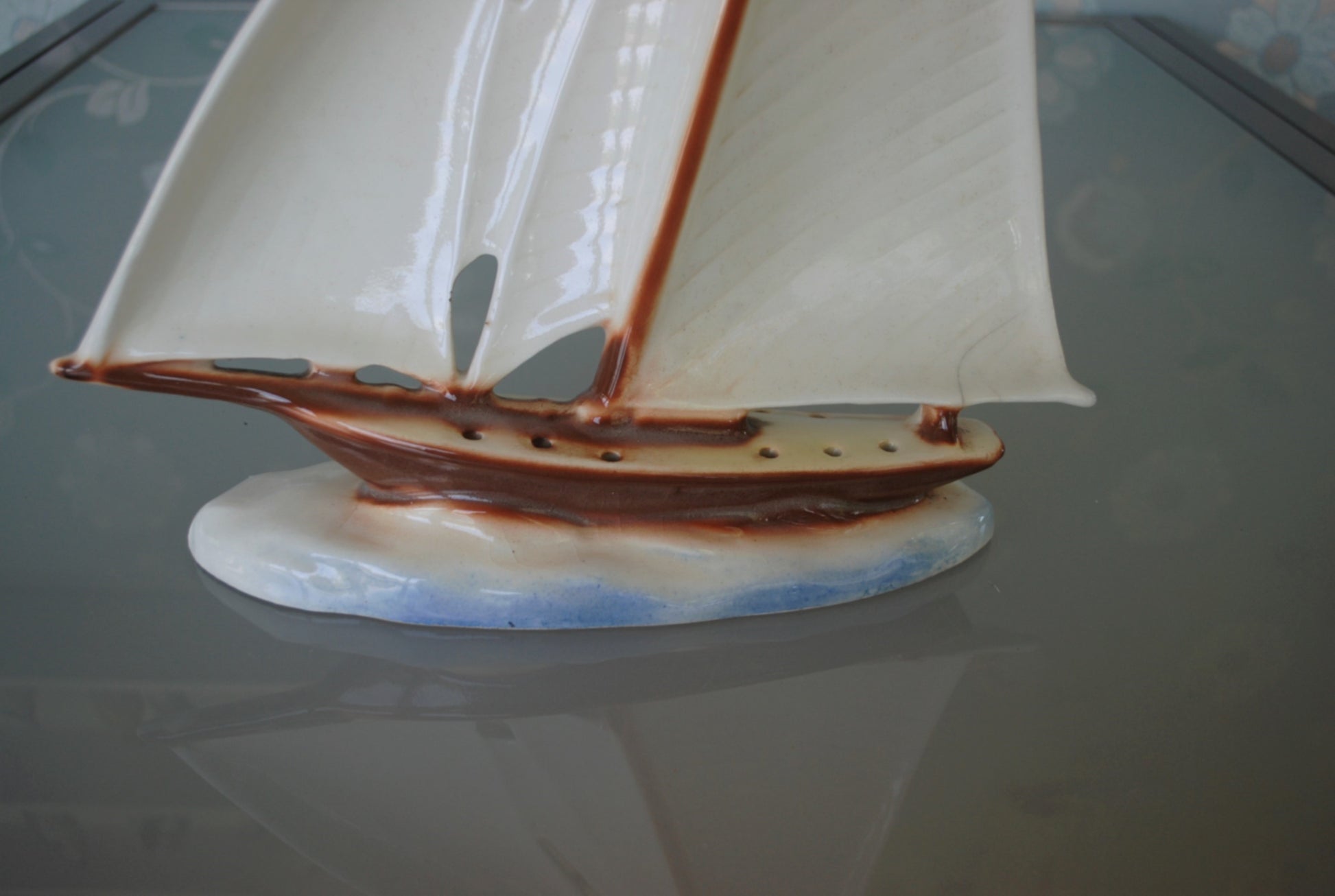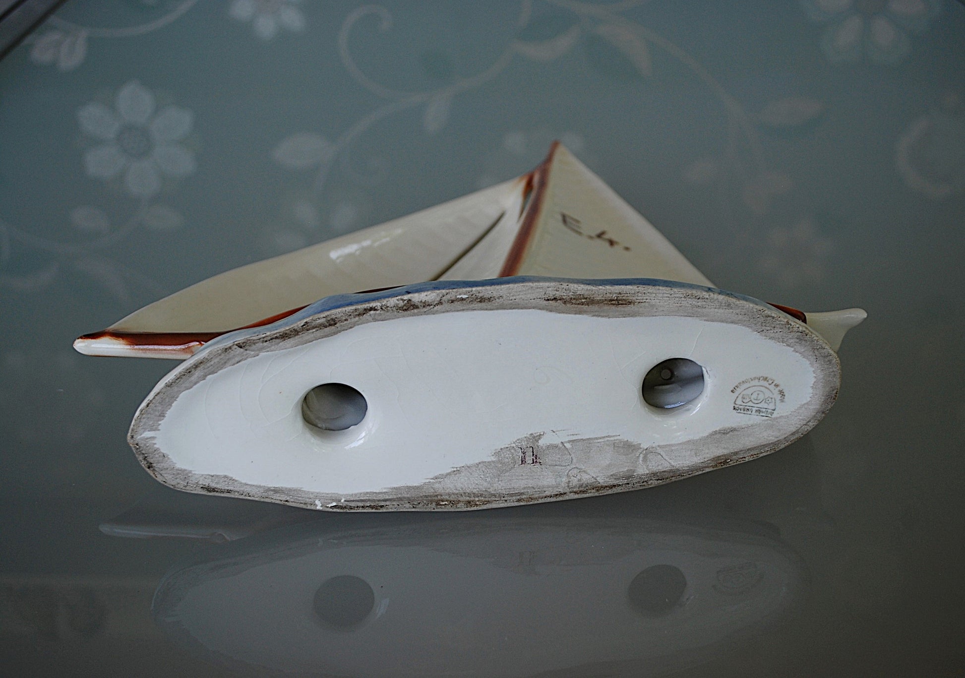 Geglazuurd keramieken boot is in zeer goede staat, wel leeftijd gerelateerde craquelé en een spanningsscheur, geen barst. Onderop de fabrieksstempel